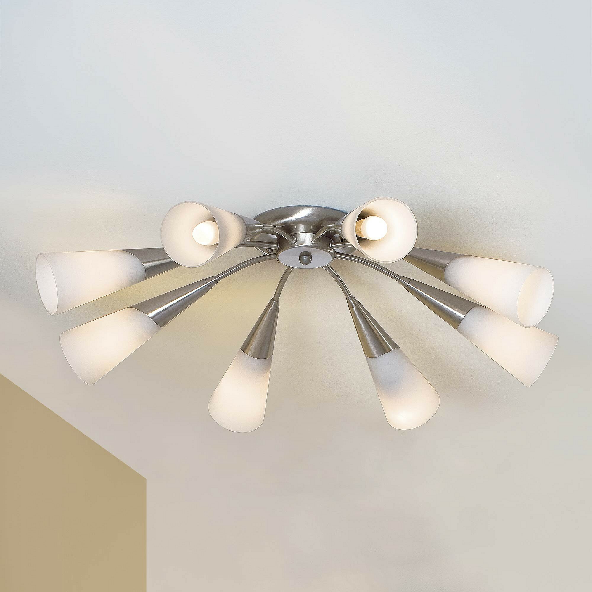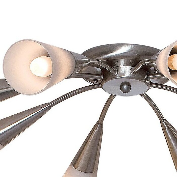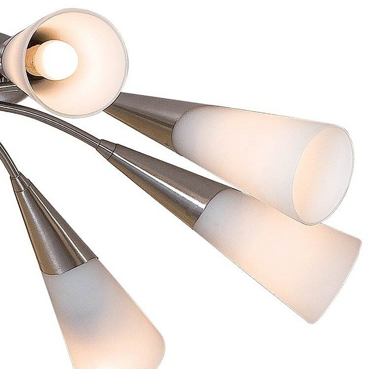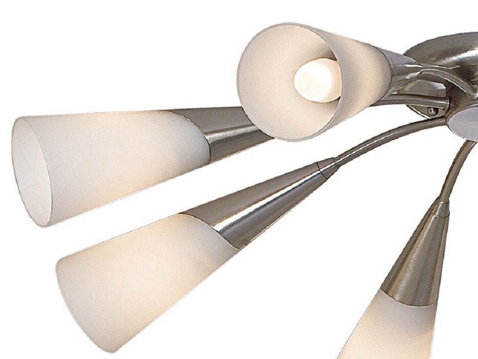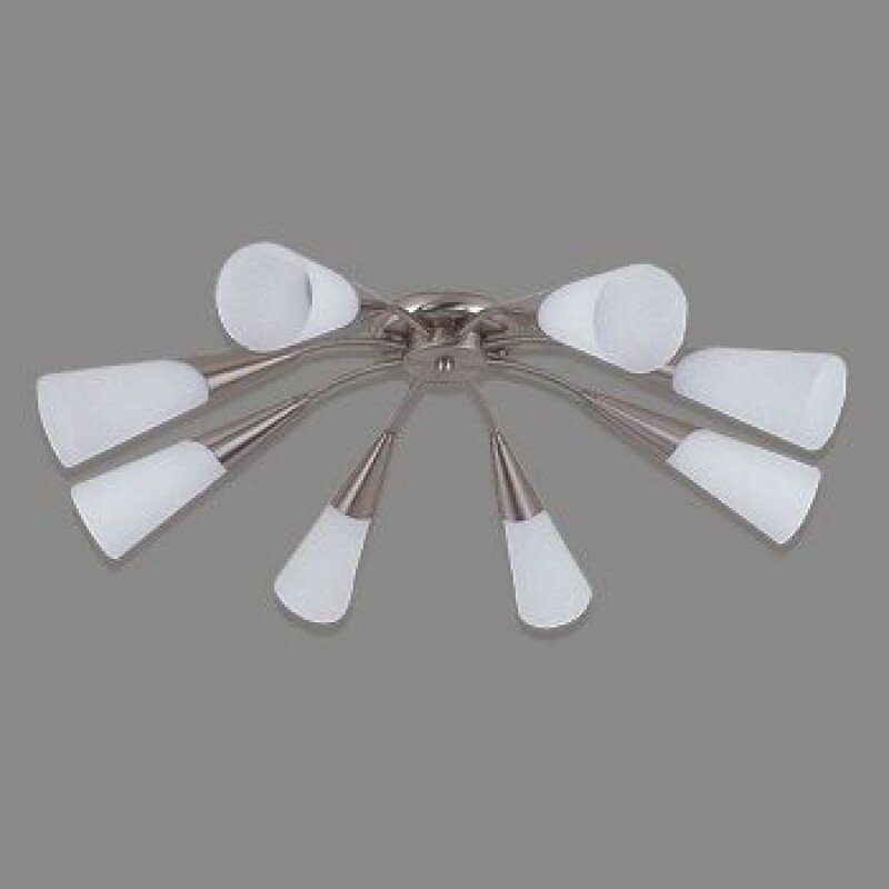 Восьмирожковая люстра Фокус поможет комфортно обустроить освещение в просторной гостиной либо холле и послужит модной деталью обстановки. Белые конусовидные плафоны, похожие на изысканные цветы, выполнены из деликатно рассеивающего свет матового стекла. Декоративная припотолочная накладка и слегка изогнутые рожки – из стойкого к истиранию хромированного металла. Элегантная модель от CITILUX отлично впишется в интерьеры: модерн, скандинавский, классический.