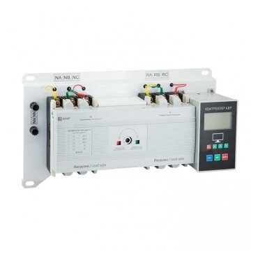 ОПИСАНИЕ. Устройство АВР TCM EKF PROxima предназначено для обеспечения резервным электроснабжением нагрузки, подключенной к системе электроснабжения, имеющей основной и резервный вводы. Устройство АВР автоматически подключает резервную линию питания в случае пропадания напряжения на основной линии. Устройство АВР ТСM EKF PROxima предназначено для обеспечения резервным электроснабжением нагрузки, подключенной к системе электроснабжения, имеющей основной и резервный вводы. Устройство АВР автоматически подключает резервную линию питания в случае пропадания напряжения на основной линии. Также устройство АВР ТСM имеет функцию защиты от токов перегрузки и коротких замыканий распределительных сетей и электродвигателей. Устройство АВР ТСM может быть настроено на несколько программ переключения. А) Питающие линии: электросеть – электросеть: автоматическое переключение на резервную электрическую линию при выходе параметров основной питающей электрической линии за установленные пределы, автоматический возврат с резервной линии на основную после восстановления параметров основной линии в установленные пределы. Установка времени задержки переключения между электрическими линиями; автоматическое переключение на вторую электрическую линию при выходе параметров первой питающей электрической линии за установленные пределы, без автоматического возврата со второй линии на первую после восстановления параметров первой линии в установленные пределы. Переключение на первую линию происходит автоматически после выхода параметров второй питающей электрической линии за установленные пределы. Установка времени задержки переключения между электрическими линиями; ручное переключение между питающими электрическими линиями. Б) Питающие линии: электросеть – генератор: автоматическое переключение на резервный генератор линии при выходе параметров основной питающей электрической линии за установленные пределы, автоматический возврат с генератора на основную после восстановления параметров основной линии в установленные пределы. Установка времени задержки переключения между электрическими линиями; ручное переключение между питающими электрическими линиями. Конструкция и основные функции: Устройство АВР выполнено в виде моноблока и состоит из контактного блока, блока управления и двух силовых автоматических выключателей в литом корпусе. На блоке управления имеется рычаг ручного переключения. Такая конструкция позволяет уменьшить высоту и площадь установки АВР.