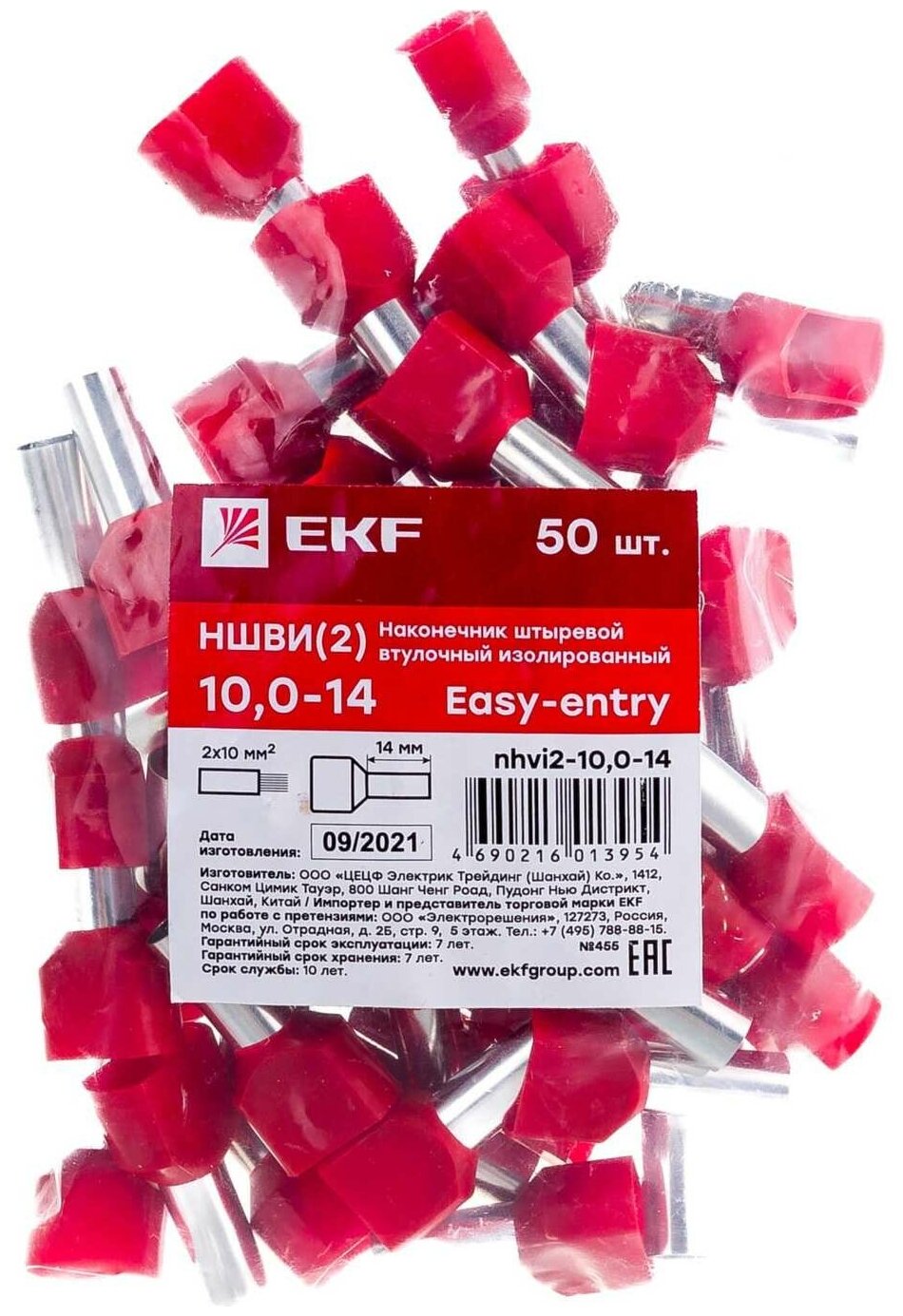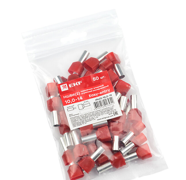 Наконечник штыревой втулочный изол. НШвИ(2) 10.0-14 (уп.50шт) EKF nhvi2-10.0-14Для удобного подключения к клеммам проводов используются втулочные и штыревые изолированные наконечники. Они надеваются на зачищенные концы проводов и опрессовываются. Правильно подобранные наконечники позволяют подсоединять провода к клеммам, рассчитанным на другие сечения. Кроме того, с помощью двойных втулочных наконечников к одной клемме можно подключить одновременно два провода. Использование наконечников обеспечивает более надежное подключение, но необходимо аккуратно фиксировать их в клемме. Чрезмерное усилие при затягивании винта может повредить наконечник. В свою очередь, плохо закрепленный наконечник не обеспечит нужный контакт. Для того чтобы затянуть винт с нужной силой (1,5–2,5 Нм), можно применить динамометрическую отвертку. Опрессовку наконечников проводят припомощи пресс-клещей. Заведите предварительно зачищенные концы провода в наконечник. Втулочный наконечник опрессуйте поверх металлической втулки, штыревой поверх изолированной ПВХ-манжеты. Выступающую из наконечника часть зачищенной жилы можно обрезать после завершения опрессовки. Перед тем как подсоединять опрессованный наконечник к клемме, проверьте, что его изоляция не нарушена, а жила надежно зафиксирована (провод не двигается внутри наконечника).