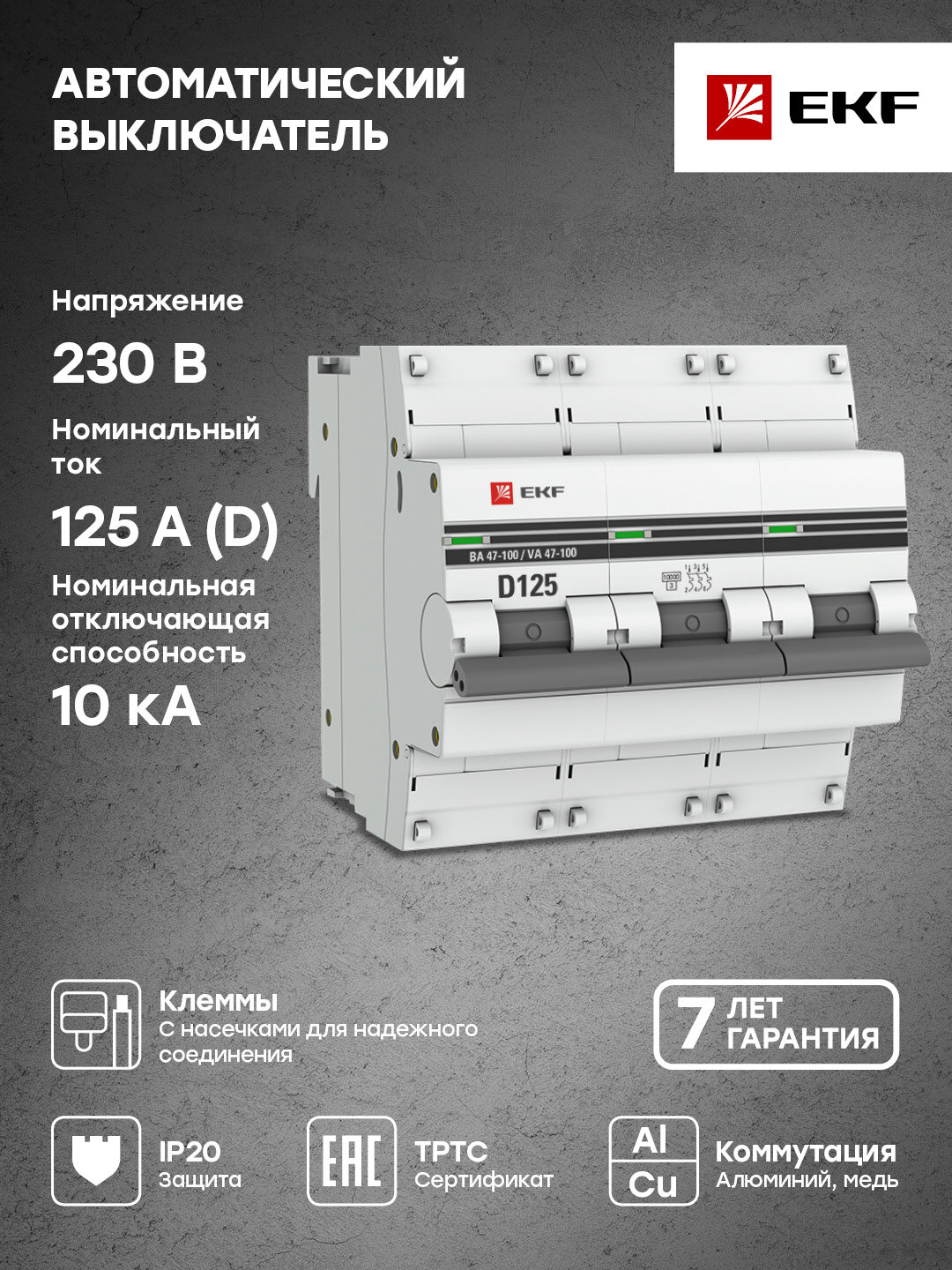 Автоматические выключатели ВА 47-100 EKF PROxima впитали в себя все преимущества предшествующей модели (взаимозаменяемы) и самые последние инновационные разработки. Производятся в одно-, двух-, трех- и четырехполюсном исполнениях. ПРЕИМУЩЕСТВА. Автоматическая доводка рукоятки управления. Клеммы с насечками для надежного соединения с проводниками. Рабочая зона закрыта диэлектриком. Индикаторное окно состояния контактов. Возможна коммутация алюминиевым и медным проводом. Двухпозиционный зажим на DIN-рейку. Углубления на корпусе для охлаждения аппарата. Монолитная лицевая панель. ОПИСАНИЕ. 1. Номинальный ток – базовое значение тока, в сравнении с которым происходят защитные действия автоматического выключателя по превышению тока нагрузки. 2. Времятоковая характеристика срабатывания – диапазон срабатывания электромагнитной защиты. С – выключатель сработает между 5- и 10-кратным значением номинального тока. Рекомендуется к установке в сетях со смешанной нагрузкой, предполагающей умеренные пусковые токи (гражданское строительство, офисные помещения). D – выключатель сработает между 10- и 14-кратным значением номинального тока. Обычно применяется для подключения электродвигателей, имеющих большие пусковые токи. 3. Класс токоограничения – расцепление происходит за 1/3 полупериода (2,5-6 мс). 4. Предельная коммутационная способность (ПКС) – это максимально возможный ток короткого замыкания, при возникновении которого автоматический выключатель сможет отключить защищаемую им цепь и остаться при этом работоспособным. 5. Номинальное напряжение – напряжение переменного тока, при котором автомат работает в нормальных условиях. ПРИМЕНЕНИЕ. Автоматические выключатели ВА 47-100 EKF PROxima применяются в административных, промышленных и жилых сооружениях: проведение тока в нормальном режиме; оперативное управление участками электрических цепей; защита от токов перегрузки и короткого замыкания; в качестве основного элемента системы конечного распределения.