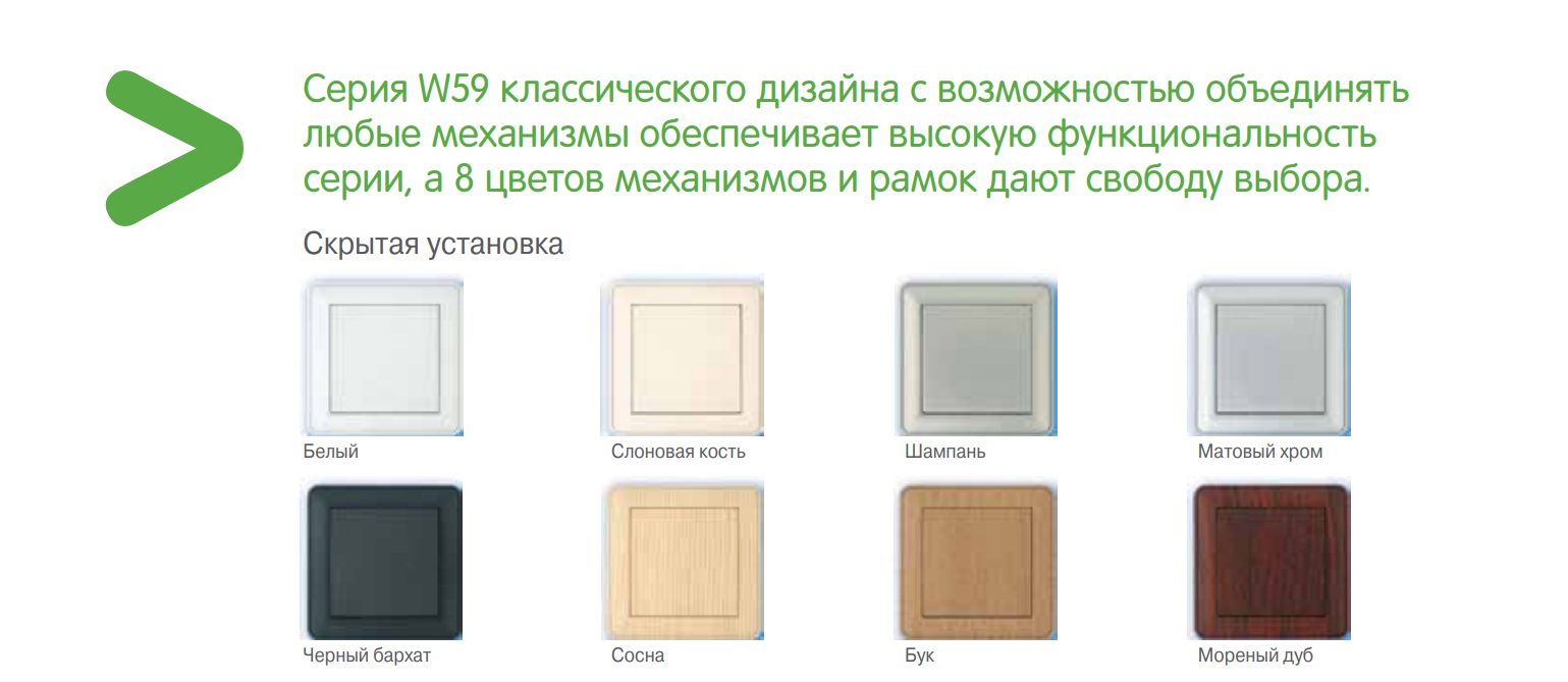 Все лицевые поверхности продукции из серии W59 выполнены из светоизносостойкого ABS-пластика. В основаниях механизмов применён специальный термостойкий материал, обладающий высокой теплостойкостью и электроизоляционными свойствами. Контакты розеток выполнены из латуни с высоким содержанием меди. Серебряные контактные группы выключателей обеспечивают надёжный электрический контакт и пожаробезопасность.