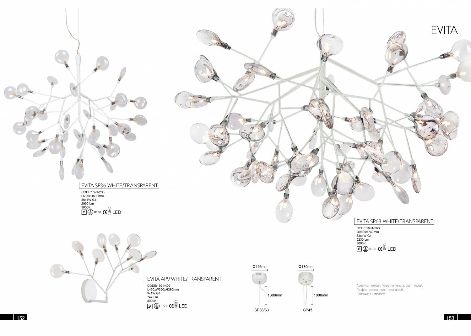Подвесная люстра EVITA SP63 WHITE/TRANSPARENT - продукт известной компании Crystal Lux (Испания). Имеет максимальную мощность 63 Вт, освещает площадь до 5 кв. м. Отлично подойдет для таких мест, как гостиная, кафе, кухня, над кухонным островом, офис. Впишется в интерьеры следующих стилей: современный, флористика, ар нуво.