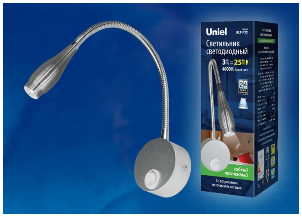 Спот светодиодный для чтения с выключателем ULT-F22-3W/4000K IP20 SILVER - продукт известной компании Uniel (Китай). Имеет максимальную мощность 3 Вт, освещает площадь до 0.6 кв. м. Отлично подойдет для таких мест, как гостиная, спальня. Впишется в интерьеры следующих стилей: техно.