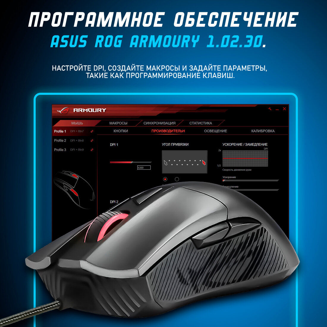 - Эксклюзивный интерфейс ROG Armoury – легкость настройки кнопок, чувствительности сенсора и параметров подсветки