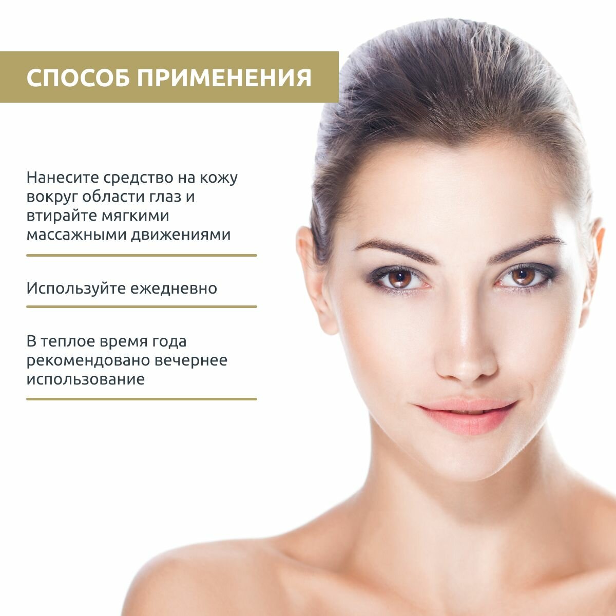 | Способ применения | Нанесите средство на кожу вокруг области глаз и втирайте мягкими массажными движениями. Используйте ежедневно. В теплое время года рекомендовано вечернее использование. |