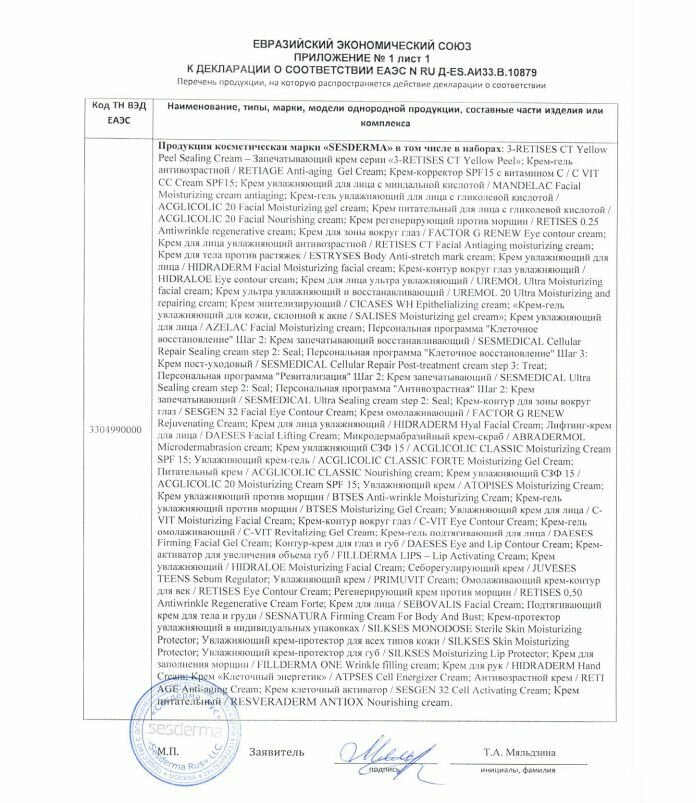 | Активные компоненты | факторы роста (TGF-B2, HGH, GM-CSF) - способствуют усилению производства коллагена и эластина в клетках кожи, повышают ее упругость и плотность, активизируют регенерацию клеток, борются с признаками старения миметические пептиды - последнего поколения глубоко увлажняют, способствуют синтезу коллагена и эластина, укрепляют кожу и придают ей упругость, борются с морщинами. стволовые клетки яблони домашней - действуют как противовоспалительное и успокаивающее средство, осветляют и выравнивают тон кожи, борются против возрастных изменений кожи, защищают кожу от агрессивного воздействия окружающей среды экстракт центеллы азиатской - стимулирует микроциркуляцию крови, способствует обновлению коллагена, оказывает противовоспалительное, антиоксидантное действие, укрепляет стенки кровеносных сосудов. эрготионеин - успокаивает кожу, опосредованно повышает клеточный метаболизм, оказывает антиоксидантный и противовоспалительный эффект, защищает от воздействия ультрафиолета, борется с признаками фотостарения витамин Е - повышает упругость кожи и борется с внешними признаками старения, мощный антиоксидант кверцетин - восстанавливает и успокаивает кожу, способствует полному усвоению гиалуроновой кислоты организмом птеростильбен - является сильным антиоксидантом и ускоряет метаболизм в клетках, замедляет старение и борется с возрастными изменениями кожи Состав: aqua, tribehenin peg-20 esters, propanediol, isostearyl isostearate, glycerin, caprylic/capric triglyceride, cyclopentasiloxane, cyclohexasiloxane, * nicotiana benthamiana hexapeptide-40 sh-polypeptide-76, nicotiana benthamiana hexapeptide 40 sh-polypeptde 2, nicotiana benthamiana hexapeptide-40 sh-oligopeptide-1, nicotiana benthamiana sh-polypeptide-15 hexapeptide-40, alcohol, bht, butylene glycol, camphanediol, carbomer, dipotassium phosphate, disodium edta, dl-alfa tocopherol acetato, ethylhexylglycerin, hydrochloric acid, lecithin, nicotiana benthamiana sh-oligopeptide-2, nicotiana benthamiana sh-polypeptide-45, nicotiana benthamiana sh-polypeptide-7, parfum, phenoxyethanol, phytonadione epoxide, pinanediol, polysorbate 20, potassium phosphate, retinal, sodium chloride, sodium cholate, triethanolamine, tromethamine, xanthan gum. |