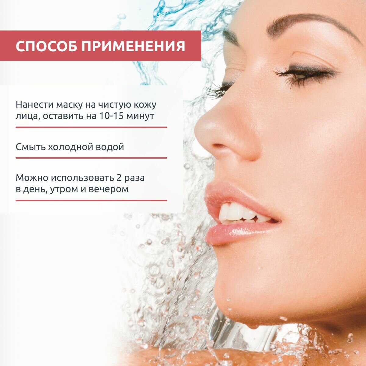 Нанести маску на чистую кожу лица, оставить на 10-15 минут. Смыть холодной водой.