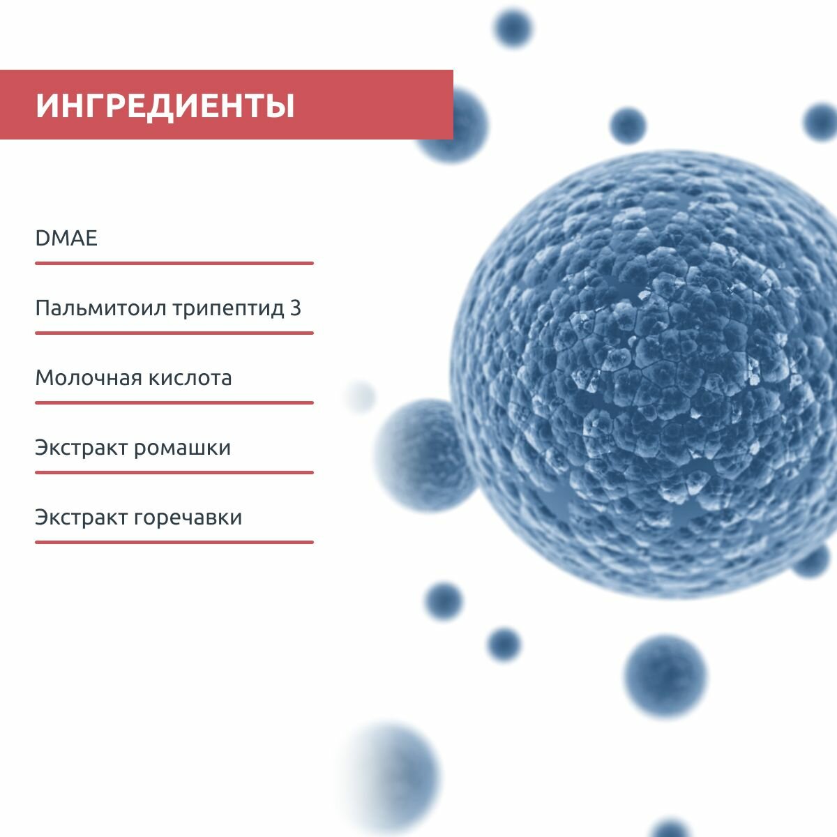| Состав | липосомированный дмае, пальмитоил трипептид-3, молочная кислота, гидролизат эластина, лизин, экстракт корня горечавки, экстракт ромашки, аллантоин, рицинолеат цинка |