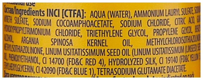 | Состав | Water, Ammonium Lauryl Sulfate, Sodium Myreth Sulfate, Sodium Cocoamphoacetate, Sodium Chloride, Citric Acid, Guar Hydroxypropyltrimonium Chloride, Triethylene Glycol, Propylene Glycol, Benzyl Alcohol, Argania Spinosa Kernel Oil, Linseed Seed Oil, Methylchloroisothiazolinone Methylisothiazolinone, Magnesium Chloride, Magnesium Nitrate, Phenoxyethanol, Fd&C Red 4 (CI 14700), Hydrolyzed Silk, Fd&C Yellow 5 (CI 19140), Ethylhexylglycerin, Fd&C Blue 1 (CI 42090), Tetrasodium Glutamate Diacetate |