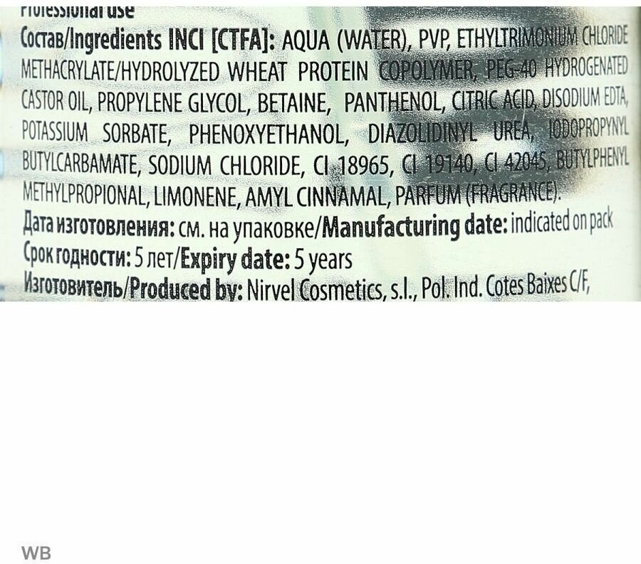 Состав: aqua (water), pvp, ethyltrimonium chloride methacrylate hydrolyzed wheat protein copolymer, peg-40 hydrogenated castor oil, propylene glycol, betaine, panthenol, citric acid, disodium edta, potassium sorbate, phenoxyethanol, diazolidinyl urea, iodopropynyl butylcarbamate, sodium chloride, ci 18965, ci 19140, ci 42045, butylphenyl methylpropional, limonene, amyl cinnamal, parfum (fragrance)