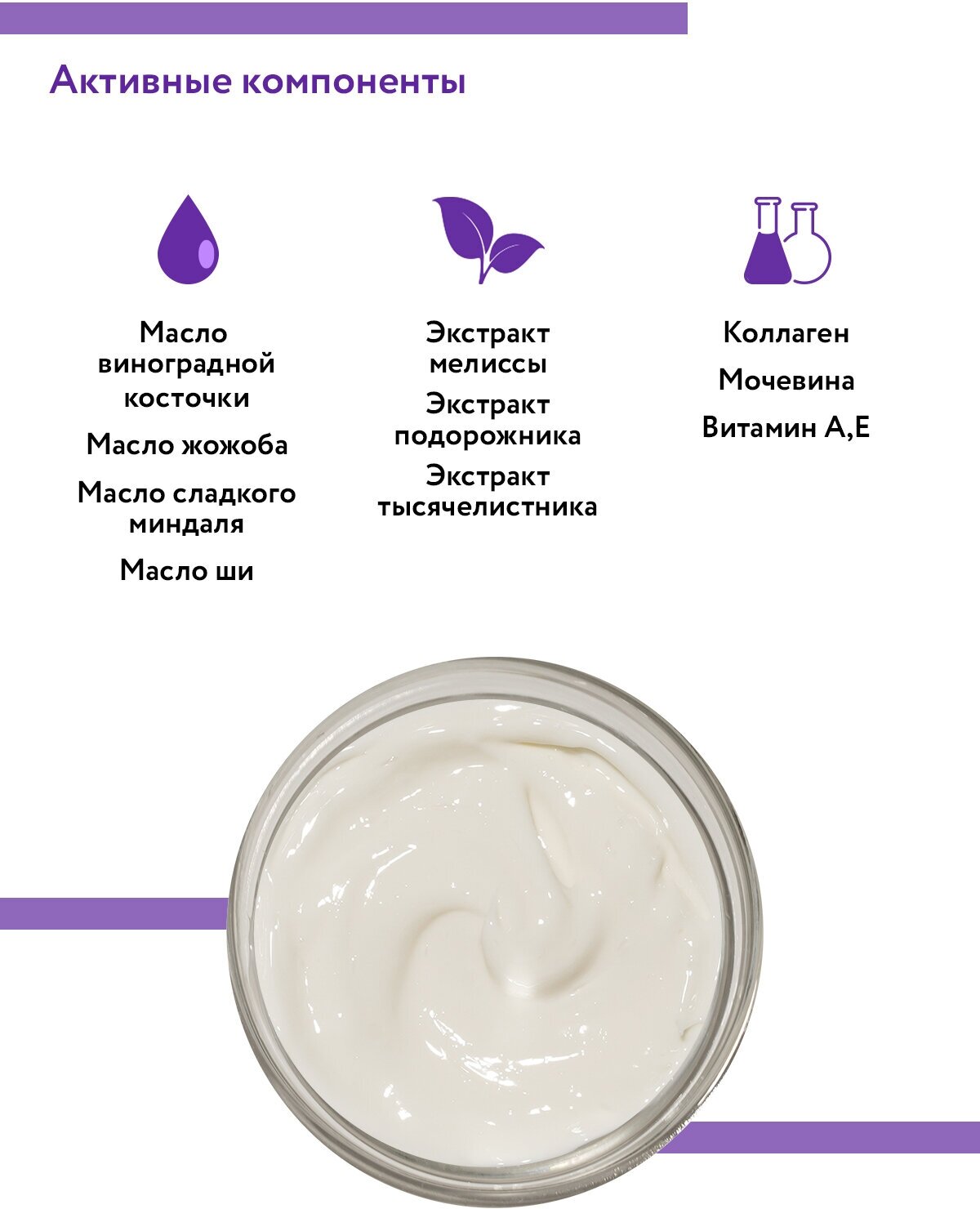 Активы: масла виноградной косточки, жожоба, сладкого миндаля, какао, ши, коллаген, мочевина, экстракты мелиссы, подорожника, тысячелистника, витамины А и Е.