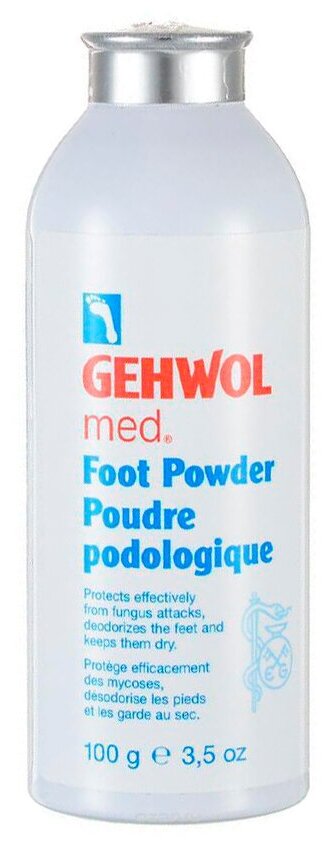 | Полное описание | Пудра Геволь-мед (Gehwol med Foot Powder) - cпециальная пудра-адсорбент для решения проблемы влажных ног (в составе оксид цинка), грибка и неприятного запаха. Пудра предупреждает болезни ног, связанные с излишком влаги и процессом разложения пота на поверхности кожи, препятствует раздражению и воспалению кожи ног. Она впитывает влагу с поверхности кожи и помогает сохранять ноги сухими, избавляет от неприятного запаха, дезодорируя кожу.Освежающие компоненты (ментол) создают ощущение легкости и прохлады. Пудра также придает коже ощущение нежности и бархатистости. Особенно рекомендуется как защитное от инфицирования средство в открытой обуви.Активные компоненты: окcид цинка, ментол, тальк, бисаболол, тимол, триклозан.Назначение:Предупреждает болезни ног, связанные с излишком влаги и процессом разложения пота на поверхности кожи.Помогает сохранять ноги сухими.Препятствует раздражению и воспалению кожи ног.Избавляет от неприятного запаха, дезодорируя кожу.Создает ощущение легкости и прохлады.Обладает противогрибковым действием.Применение |
