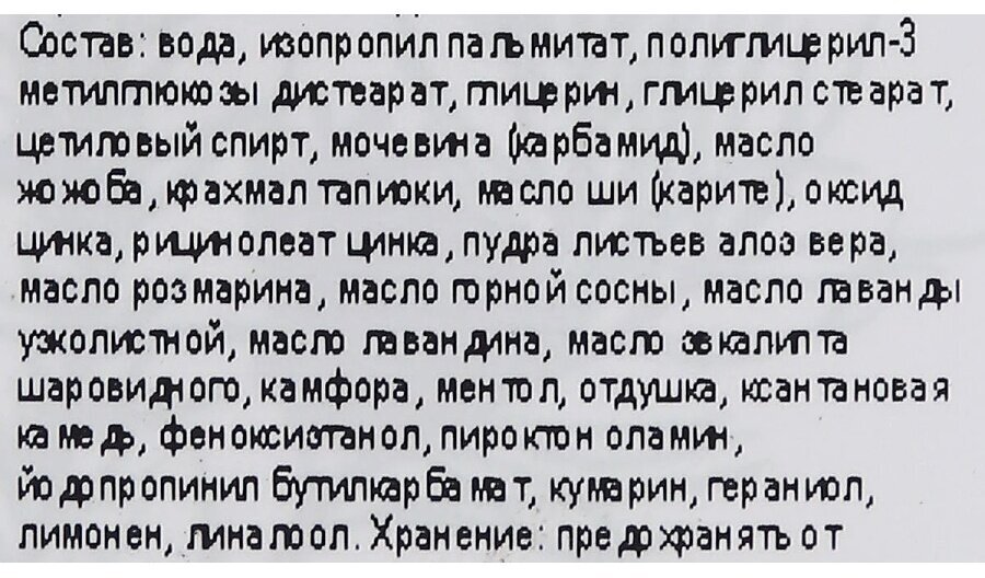 | Состав | аqua, Glycol Stearate SE, Isopropyl Palmitate, Propylene Glycol, Rosmarinus Officinalis, Pinus, Lavandula Angustifolia, Lavandula Hybrida, Eucalyptus Globulus, Camphor, Menthol, Parfum, Farnesol, Climbazole, Ethylparaben, Imidazolidinyl Urea |
