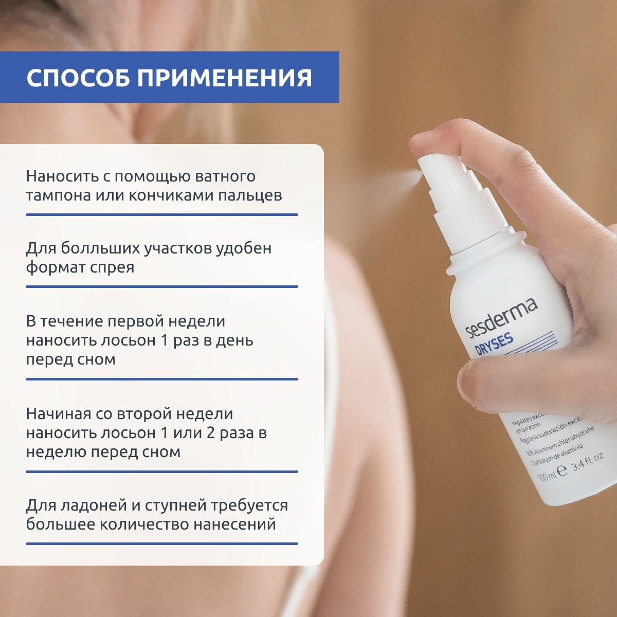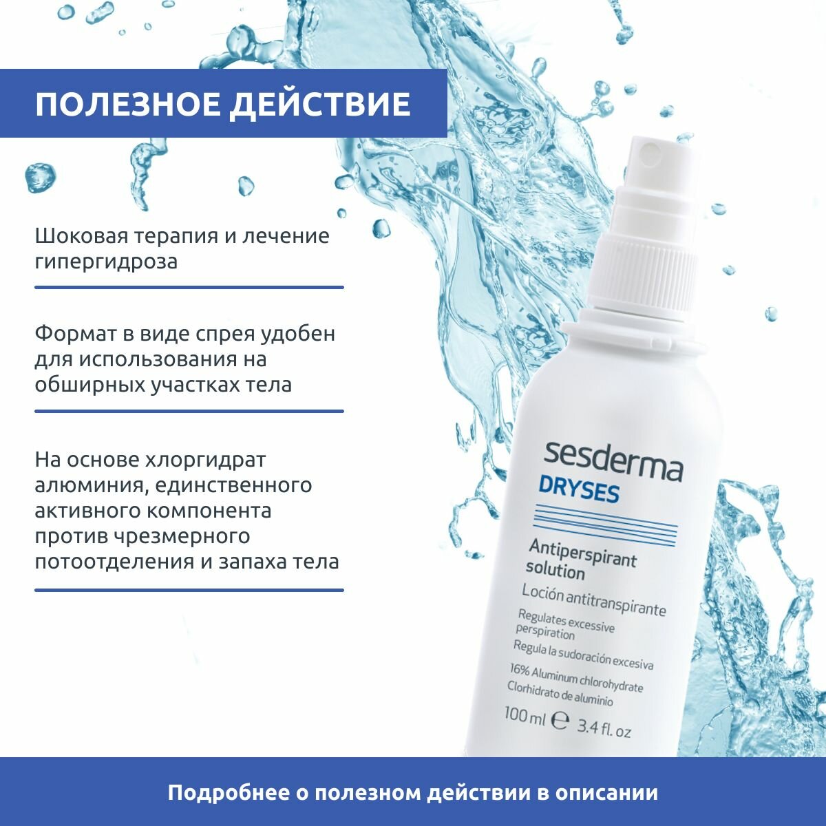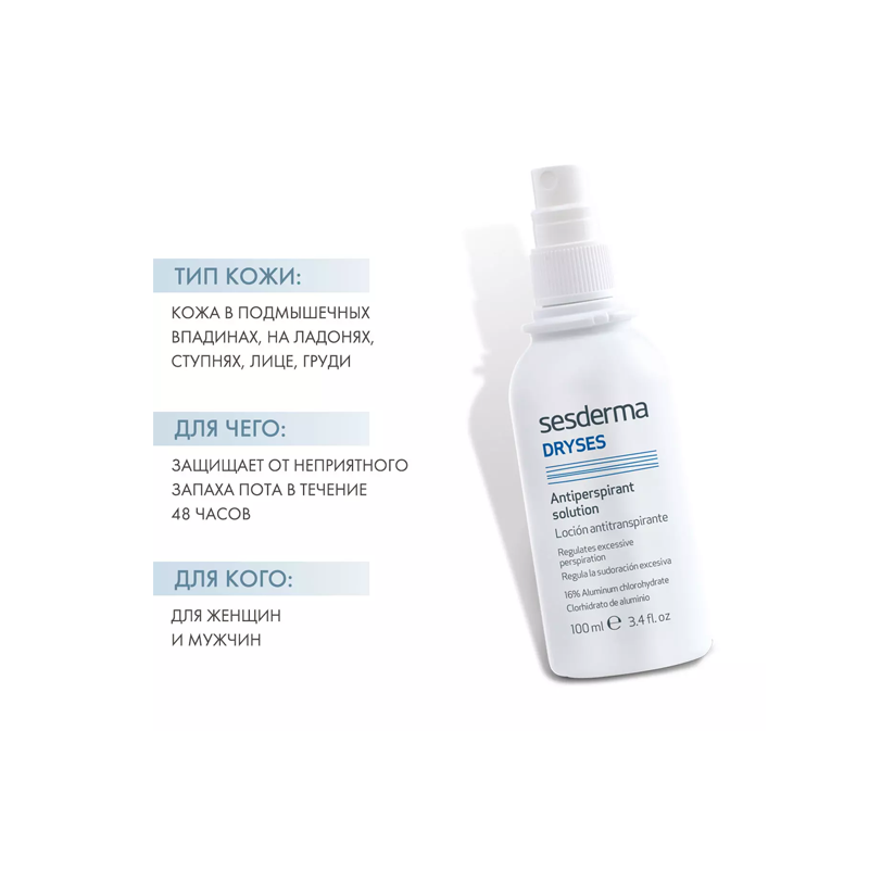 Лосьон-антиперспирант для тела DRYSES Antipersperant solution в формате спрея на основе хлоргидрата алюминия предназначен для косметического ухода при гипергидрозе. Эффективен в подмышечных впадинах, на ладонях, ступнях, лице, груди. Оказывает мощное бактерицидное действие, избавляет от чрезмерной потливости и запаха пота.
