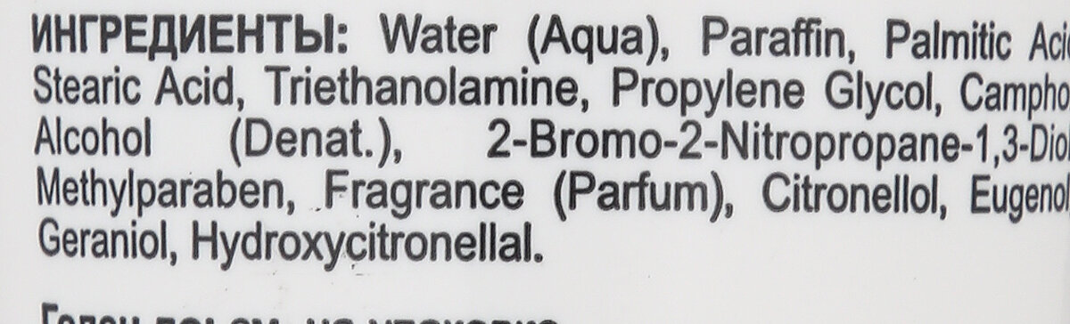 | Состав | water (aqua), paraffin, palmitic acid, stearic acid, triethanolamine, propylene glycol, camphor, alcohol sd-40 (denat.), 2-bromo-2-nitropropan-1,3-diol, methylparaben, parfum (fragrance), citronellol, eugenol, geraniol, hydroxycitronellal |