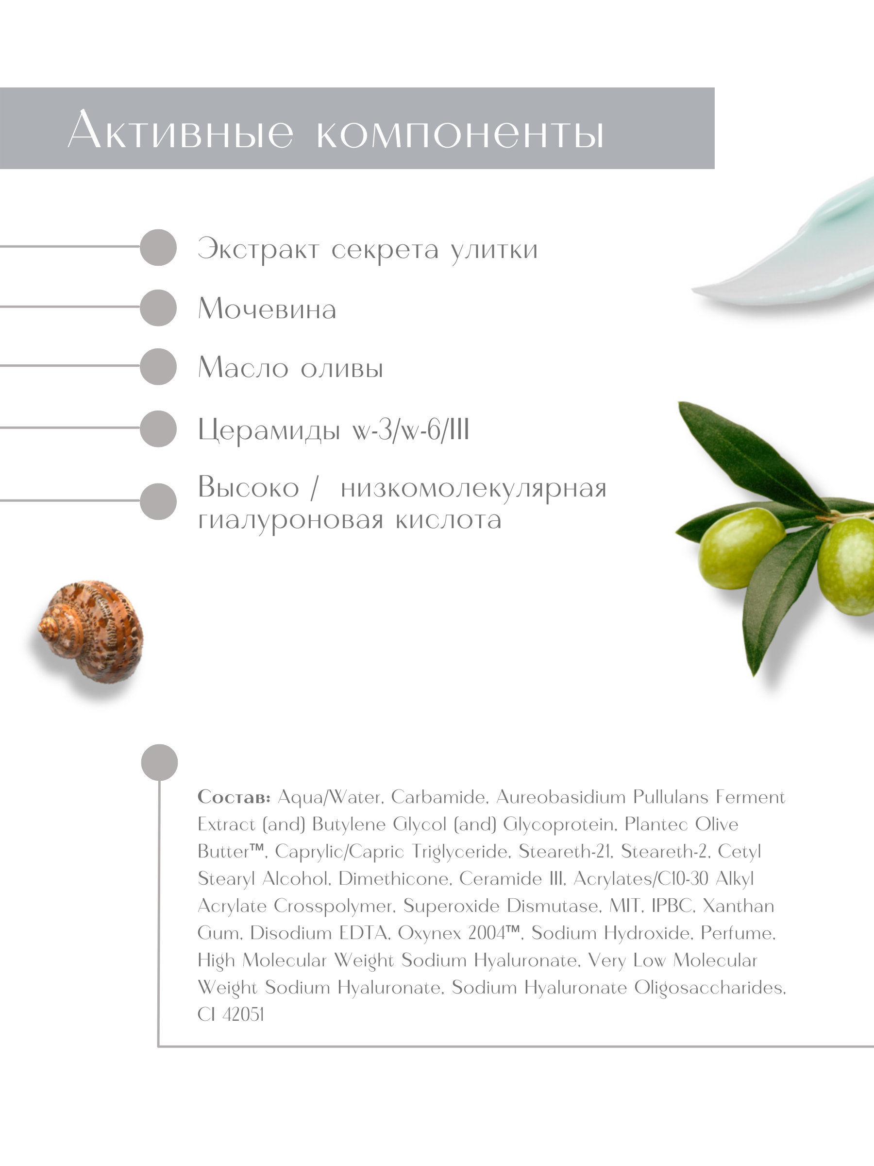 | Состав | Aqua/Water, Carbamide, Aureobasidium Pullulans Ferment Extract (and) Butylene Glycol (and) Glycoprotein, Plantec Olive Butter, Caprylic/Capric Triglyceride, Steareth-21, Steareth-2, Cetyl Stearyl Alcohol, Dimethicone, Ceramide III, Acrylates/C10-30 Alkyl Acrylate Crosspolymer, Superoxide Dismutase, MIT, IPBC, Xanthan Gum, Disodium EDTA, Oxynex 2004™, Sodium Hydroxide, Perfume, High Molecular Weight Sodium Hyaluronate, Very Low Molecular Weight Sodium Hyaluronate, Sodium Hyaluronate Oligosaccharides, CI 42051 |