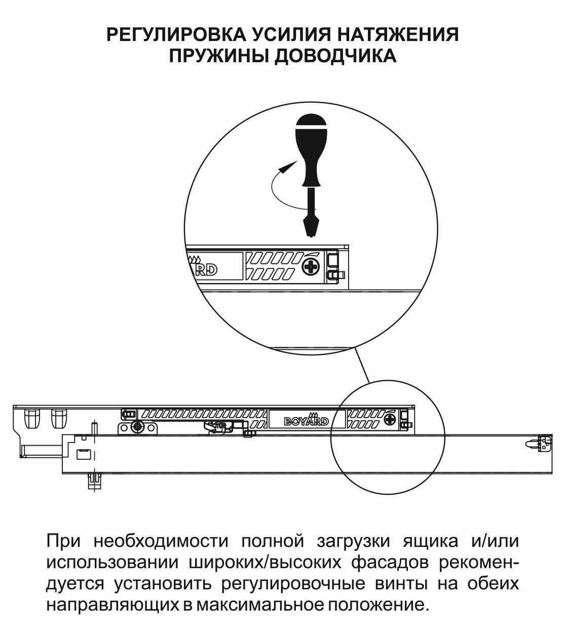 - Adapt-auto — адаптивная регулировка усилия работы доводчика — уникальное технологическое решение BOYARD, которое позволяет легко и быстро в домашних условиях ослабить или усилить натяжение пружины доводчика. Опция Adapt-auto незаменима в случае нестандартной нагрузки, когда неглубокий ящик имеет высокий и тяжелый фасад, или же когда груз внутри ящика распределен ближе к фасаду. В случае многолетней активной эксплуатации мебели пружину доводчика можно подтянуть и доводчик будет работать как в день установки направляющих. Усиливать или облегчать натяжение пружины пользователи мебели могут самостоятельно, выставив подходящее положение регулировочного винта в доводчике при помощи обычной крестовой отвертки.