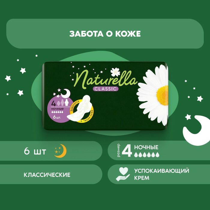 Мягкие гигиенические прокладки Naturella Classic Night Ромашка с крылышками, помогающими надежно фиксировать прокладку, на 40 % шире и обеспечивают дополнительную защиту в ночное время при обильных выделениях. Это единственные женские прокладки, содержащие Dermacrem уникальный сухой лосьон против раздражения кожи, действие которого доказано клинически. Гигиенические прокладки Naturella Classic Night обладают ароматом ромашки и снабжены желобками в форме цветка с эксклюзивной впитывающей системой, а впитывающие волокна помогают распределять и удерживать жидкость внутри, обеспечивая сухость и комфорт. прокладки Naturella обеспечивают дополнительную защиту, необходимую во время менструации, бережно заботясь о вашей коже в течение всей ночи. Менструация может быть сопряжена с некоторыми проблемами, и в это время средства защиты не должны быть еще одним источником дискомфорта. Для ежедневной защиты и свежести воспользуйтесь ежедневными прокладками Naturella.