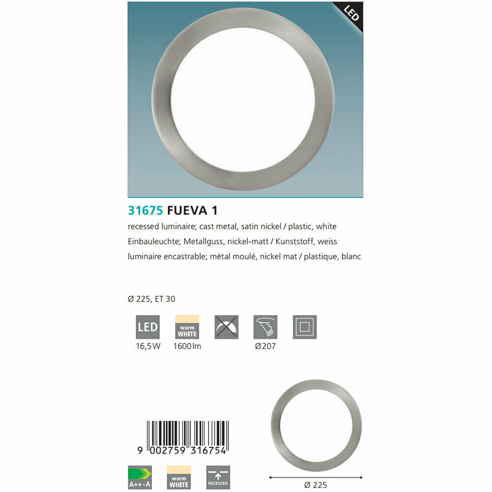 Встраиваемый светодиодный светильник Fueva - продукт известной компании Eglo (Австрия). Имеет максимальную мощность 16 Вт, освещает площадь до 3 кв. м. Отлично подойдет для таких мест, как гостиная, прихожая и коридор, спальня, кабинет, кухня. Впишется в интерьеры следующих стилей: современный.