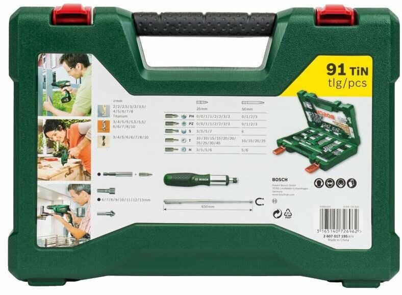 Набор принадлежностей V-line Bosch 2607017195 применяется в домашней мастерской совместно с дрелью и шуруповёртом. Комплект включает оснастку для для монтажа/демонтажа различных крепежных элементов и сверления отверстий в различных материалах. Кейс для удобной транспортировки и хранения прилагается.