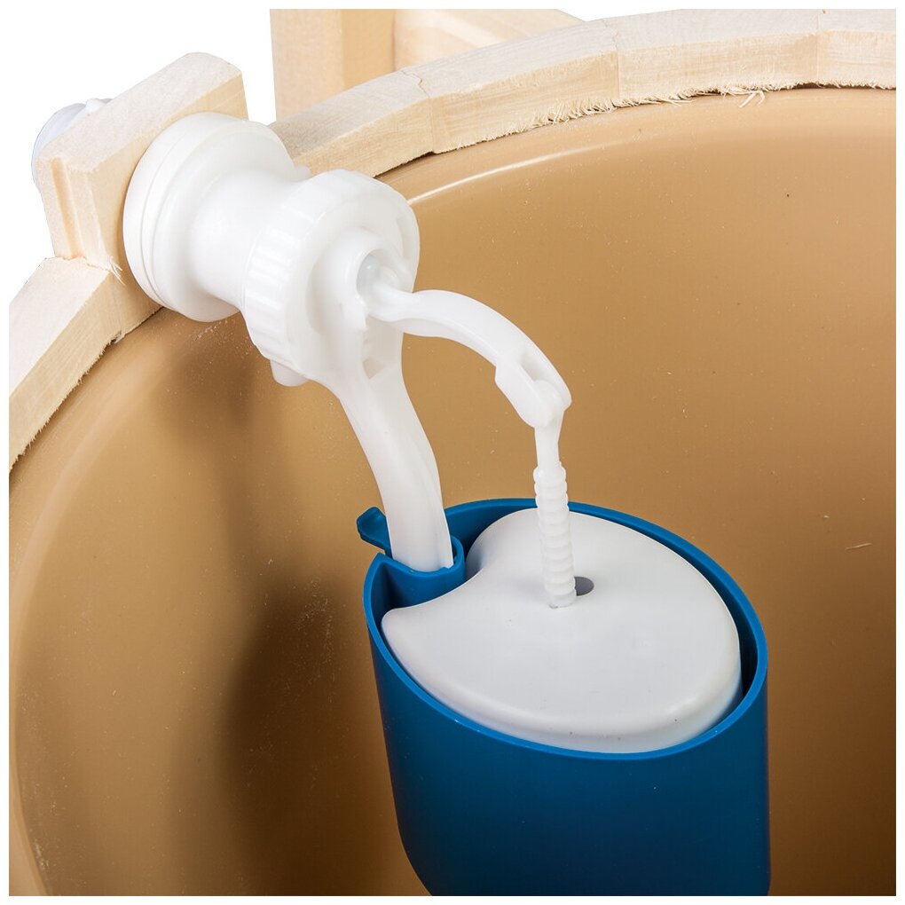 Деревянная конструкция подвешивается к стене и представляет собой ведро, свободно переворачивающееся, если потянуть за специальную цепочку. Внутри деревянного ведра установлен пластиковый контейнер, который заполняется холодной водой. Ее уровень регулирует специальный поплавок-клапан, что исключает перелив.