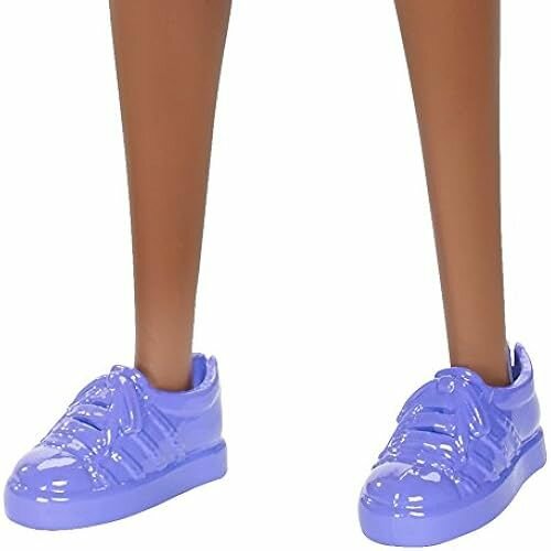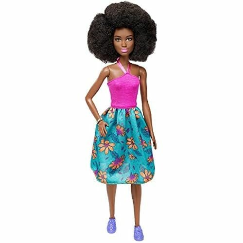 Темнокожая кукла Барби из серии «Игра с модой» с черными афроамериканскими волосами и красивым макияжем. Кукла одета в блестящий розовый топ с пышную бирюзовую юбку с цветочным принтом. На ногах фиолетовые ботинки, на руке браслет.