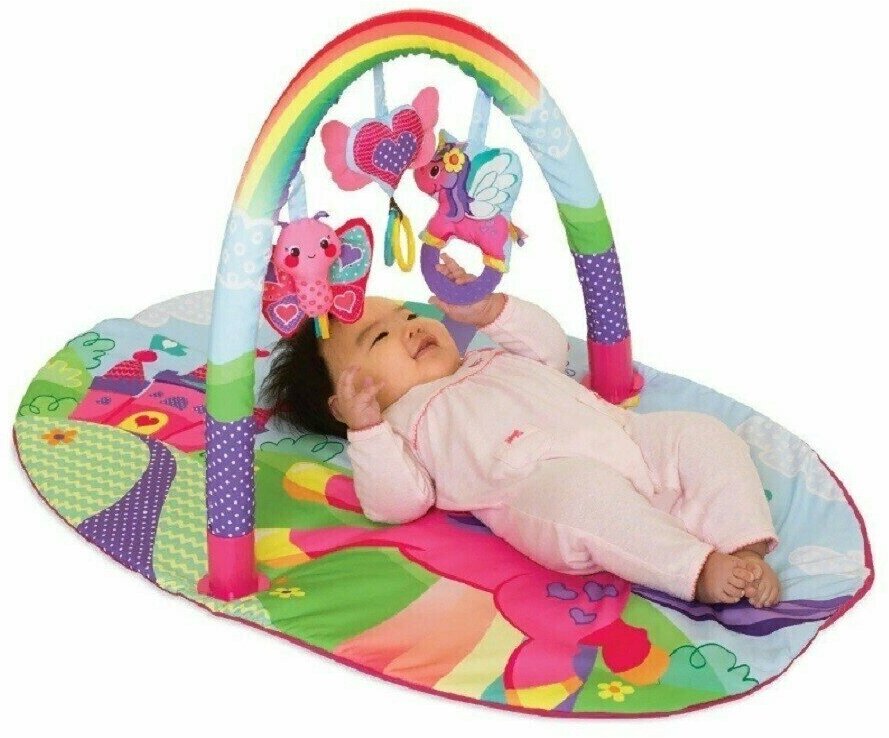 Портативный коврик "Удивительная радуга" от Infantino станет отличным подарком для Вашего малыша! На нем можно лежать, играть и отдыхать. Коврик выполнен из качественных и приятных на ощупь текстильных материалов. Пестрые и яркие цвета тренируют цветовосприятие и зрение. К коврику прикреплена дуга, на которой расположены 3 мягкие игрушки в виде бабочки, единорога и сердечка. Игрушки украшены различными элементами в виде ленточек, колец и прорезывателя. Благодаря разным материалам и текстурам они помогают малышу тренировать тактильные ощущения, координацию и мелкую моторику. Коврик можно складывать пополам и брать с собой.