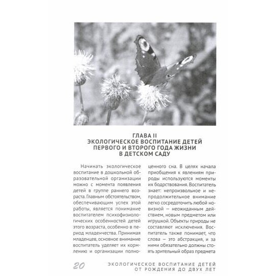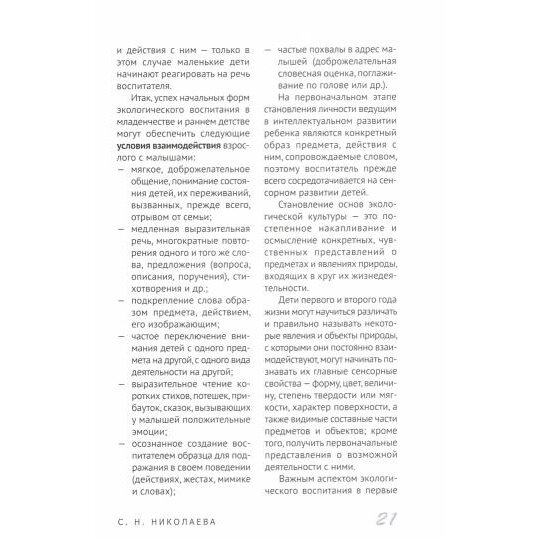 В методическом пособии представлена система образовательной работы по экологическому воспитанию детей первого и второго года жизни, основанная на результатах многолетних исследований известного ученого-педагога С.Н. Николаевой. Автор дает общую характеристику условий успешного экологического воспитания детей в семе и в дошкольной образовательной ор-ганизации, приводит конкретные методические рекомендации, описывает содержание наблюдений, прогулок, развивающих занятий, игр и досугов. Книга входит в базовый учебно-методический комплект для реализации образовательной программы "Теремок" для детей от двух месяцев до трех лет. Адресуется педагогам раннего детства, студентам педагогических колледжей и вузов, методистам системы повышения квалификации и профессиональной переподготовки работников образования, специалистам консультационнометодических центров. Будет интересна родителям детей раннего возраста и сертифицированным няням.