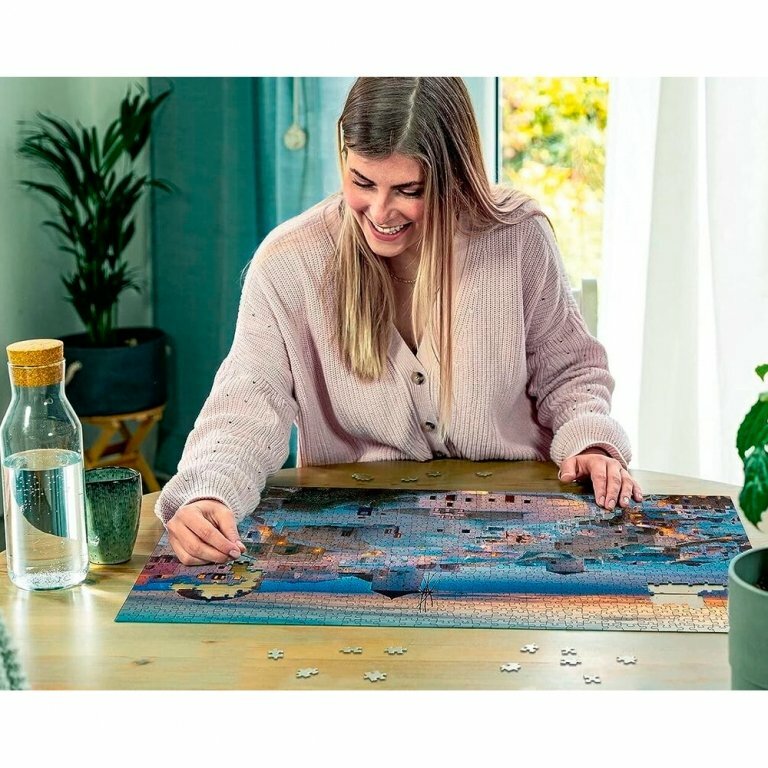 Ravensburger Пазл Вечерний Санторини 1000 элементов 19611 Пазл "Вечерний Санторини", состоящий из 1000 элементов, подарит море увлекательного времени и потрясающий результат. Качественные детали, использованные в пазле, обладают матовым эффектом, который улучшит готовую картинку. Собрав пазл, владелец может воспользоваться специальным клеем, который приобретается отдельно, и поместить фотографию в большую рамку. Санторини - один из красивейших островов Средиземноморья, обладающий удивительной зачаровывающей романтикой. Остров вулканического происхождения в Эгейском море в свете уходящих лучей солнца прекрасен и неподвластен времени. Белые стены множества домиков, переплетающихся в бесконечном лабиринте, освещены десятками горящих светильников, вырывающихся из их окон. На фоне бескрайнего неба, соединенного с полоской моря, остров создает впечатление рая на земле, который не слышал о времени, увядании и тревогах. Такая фотография обязательно будет переносить в удивительную атмосферу спокойствия и расслаблять всех зрителей этой живописной картины. Размер собранного пазла: 70 х 50 см.