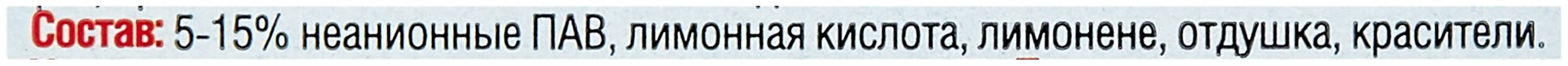 Состав: 5-15% неанионные ПАВ, лимонная кислота, лимонене, отдушка, красители.