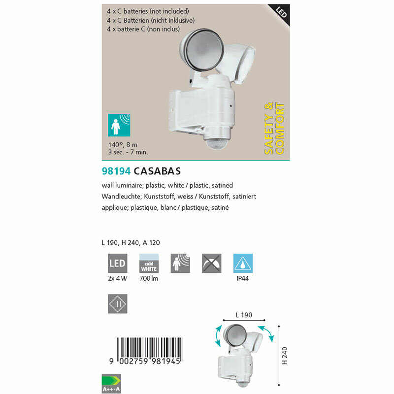 Прожектор уличный Casabas 98194 - продукт известной компании Eglo (Австрия). Имеет максимальную мощность 8 Вт, освещает площадь до 2 кв. м. Отлично подойдет для таких мест, как фасад. Впишется в интерьеры следующих стилей: современный.