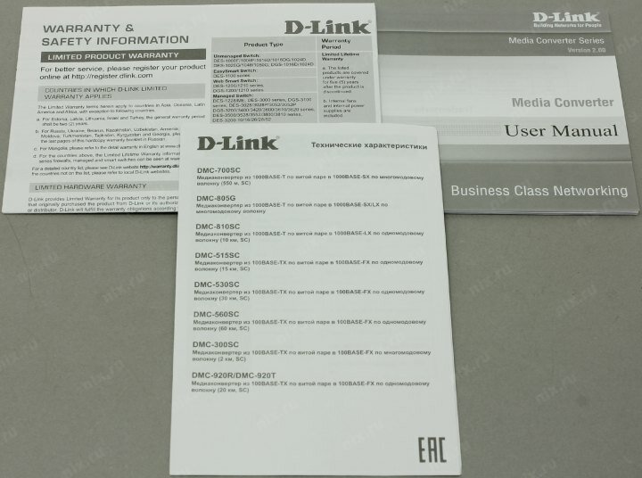 | Комплектация | Медиаконвертер DMC-810SC, Адаптер питания, Эксплуатационная документация, Гарантийный талон |