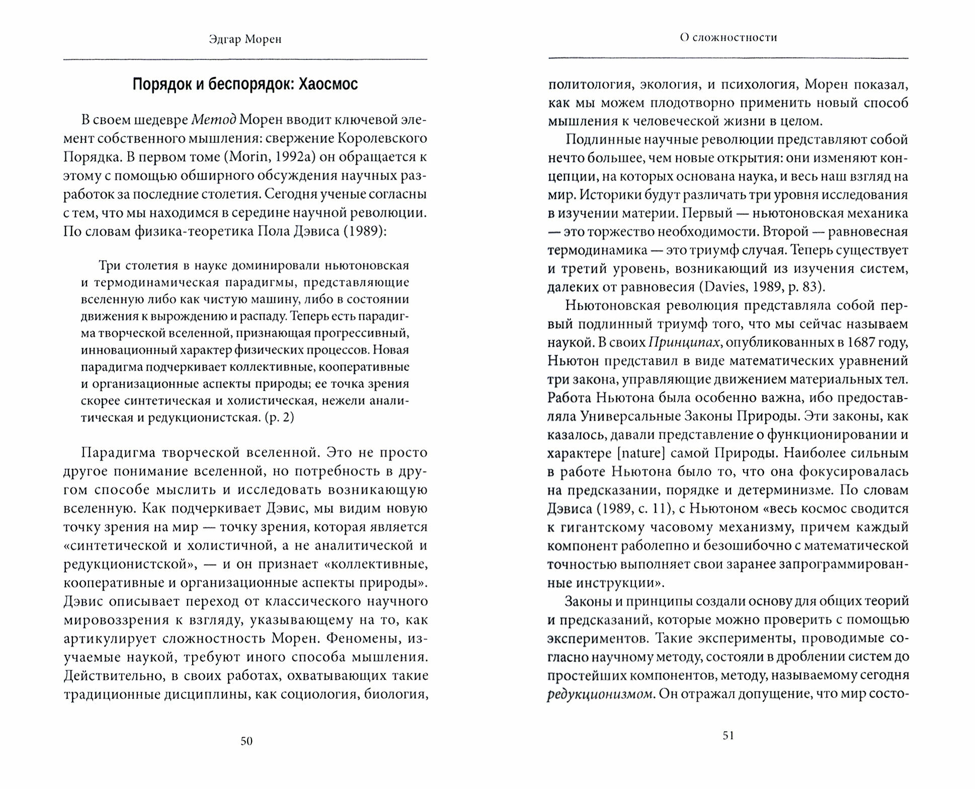 Книга крупнейшего французского философа и социолога с мировым именем Эдгара Морена «О сложностности» является доступным и конструктивным введением в его весьма непростой концептуальный аппарат. Согласно Морену, термин «сложностность» применим как к физическому миру и человеческой культуре, так и к способам осмысления и мира, и культуры. Морен говорит о «сложностном мышлении», ориентированном не столько на понятия, сколько на «когнитивные операторы». Такое мышление обладает уникальной способностью перемещаться между естествознанием, социологией, психологией и философией, не возвышая ни одно из этих направлений мысли. Оно идеально подходит для решения эпистемологических, этических и практических задач, формирующих проблемы нашего времени. Морен утверждает, что противоречие между разумом и интуицией не обязательно означает взаимное исключение, поскольку они являются полярностями, которые дополняют друг друга, не переставая быть антагонистическими. Одним из принципов сложностного мышления Морен считает принцип диалога. Он полагает, что напряженность, создаваемая сосуществованием противоположностей, приводит к постоянному появлению новых свойств, которые приводят к перестройке систем на более высоких уровнях сложности.