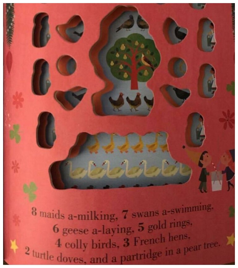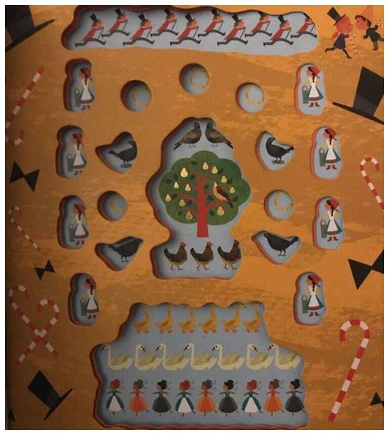 Великолепная книга в восхитительном исполнении ! Ажурная вырубка на страницах из плотного картона завораживает ! С каждой страницей окошек становится всё больше и больше ,как и рождественских подарков в песне ! Цвета богаты и привлекательны! На каждом развороте будто оживает сказка! Подарочный вариант!