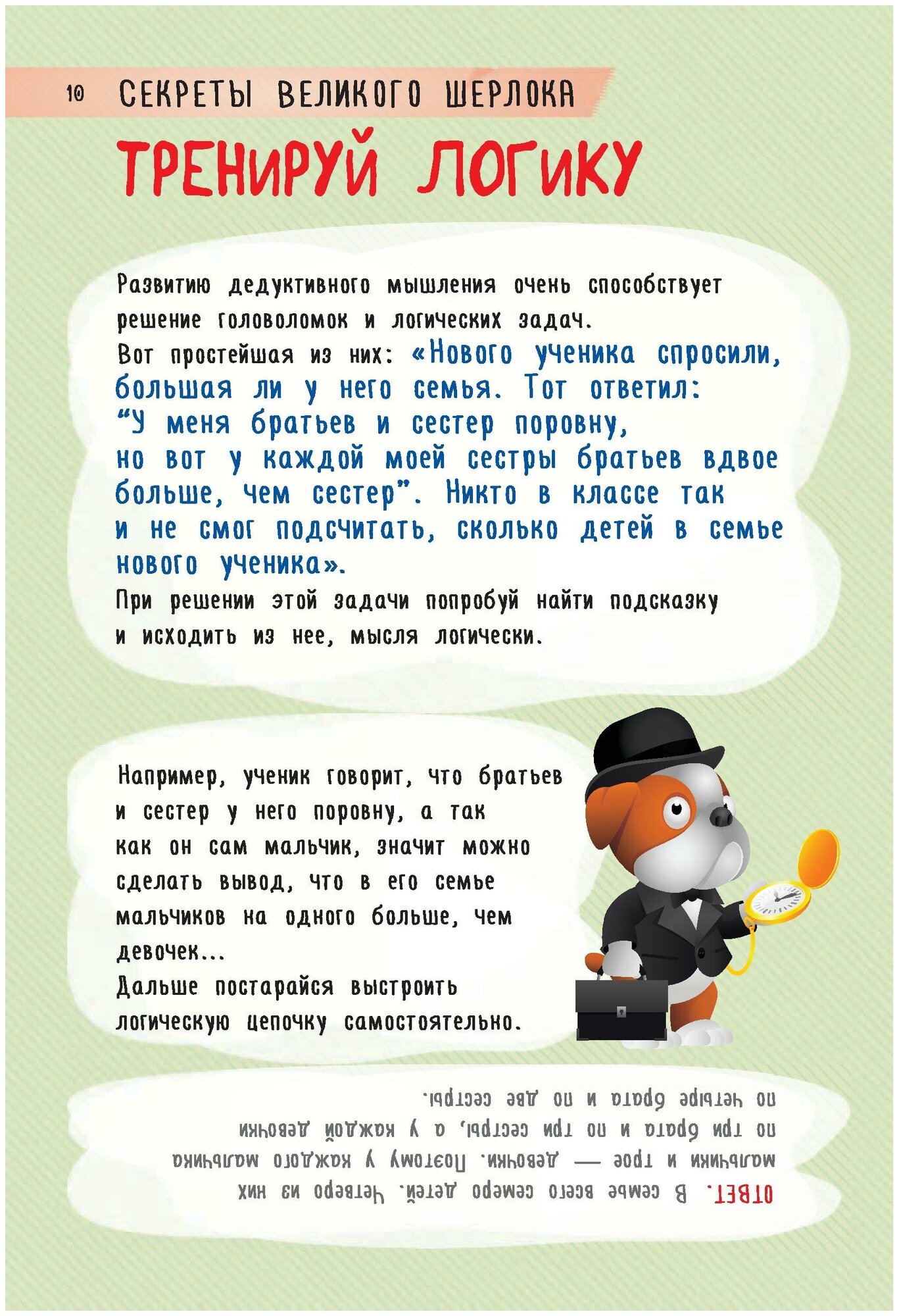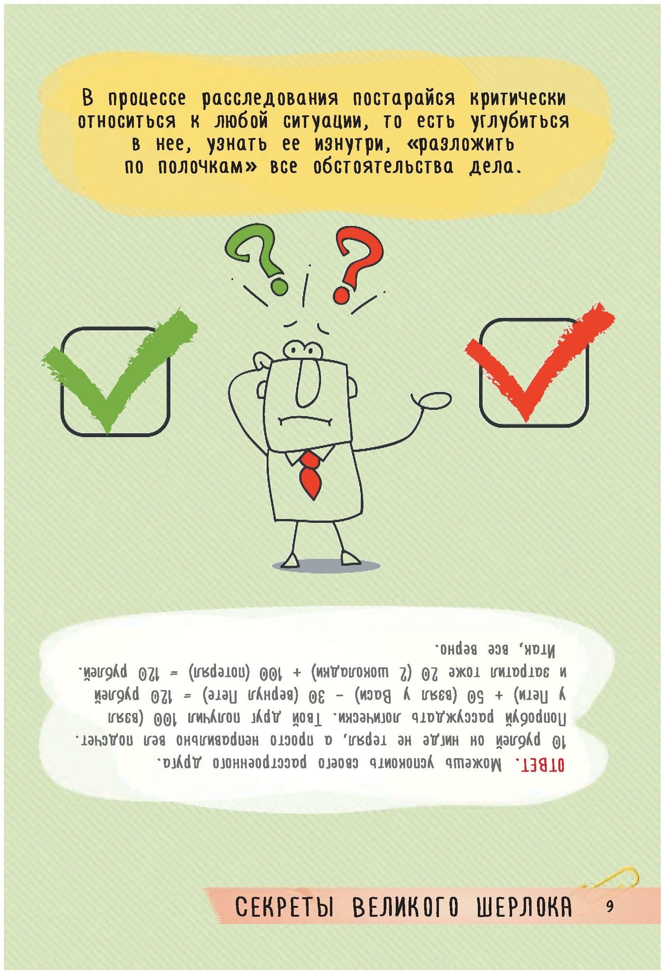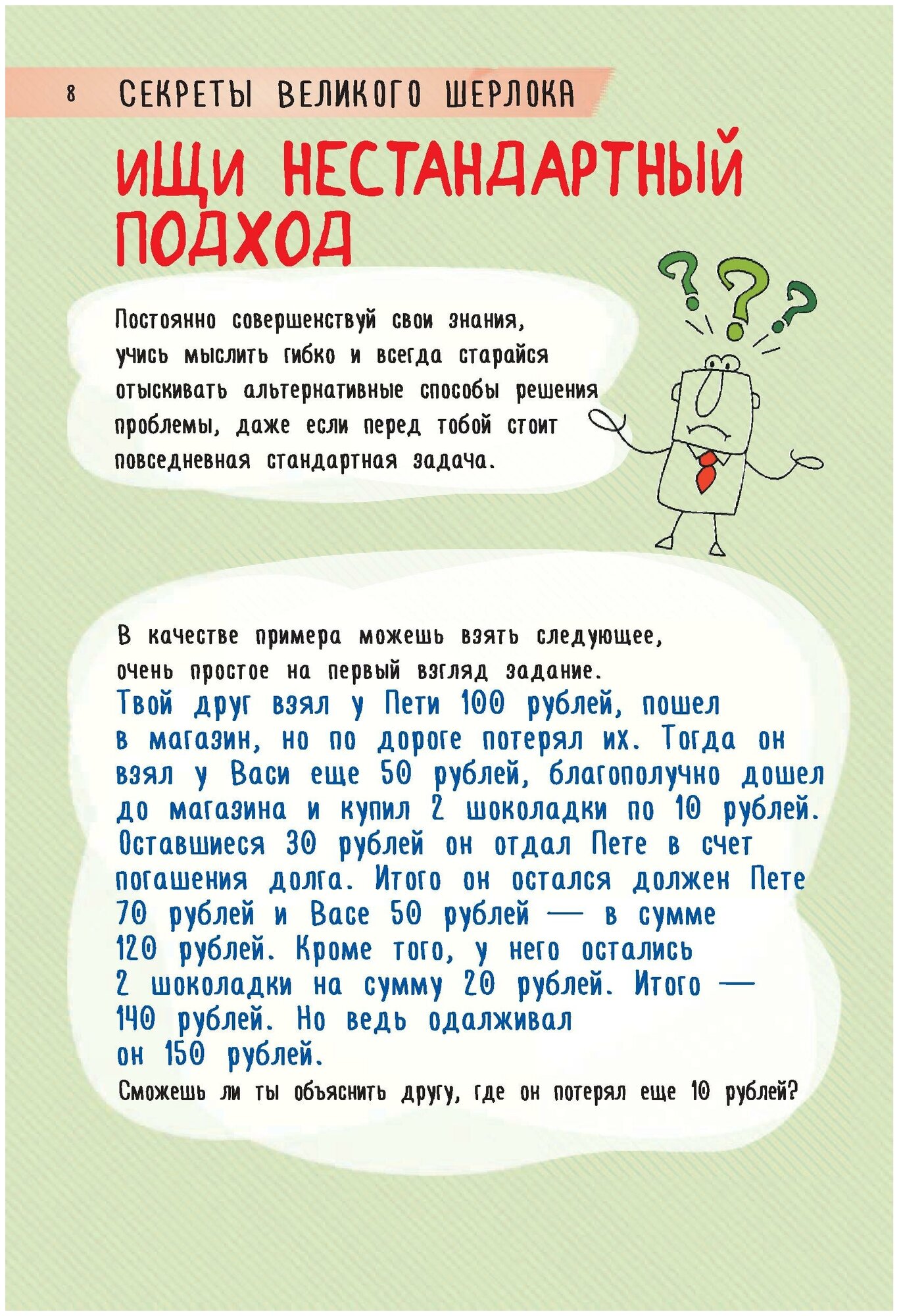 Не знаешь, чем заняться в свободное время? Может быть, попытаешься представить себя в роли сыщика? Ведь ты наверняка слышал о великом Шерлоке Холмсе - знаменитом персонаже произведений, написанных Артуром Конан Дойлом. Открой эту книгу - и ты узнаешь главные секреты и уловки настоящих детективов. На ее страницах есть всё - как правильно вести слежку и как уходить от нее, как снимать отпечатки пальцев и составлять фоторобот, как не пропустить важные улики и использовать детектор лжи. А главное - здесь тебя ждут увлекательные детективные задачки, иллюстрированные подробными рисунками. Подключай логику и наблюдательность, сопоставляй факты и находи улики, решай головоломки, используя дедуктивный метод, - почувствуй себя великим сыщиком.