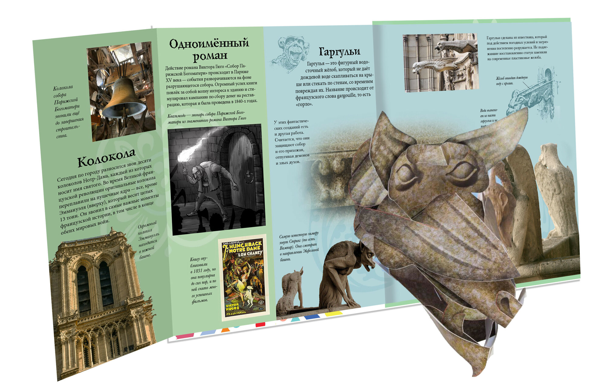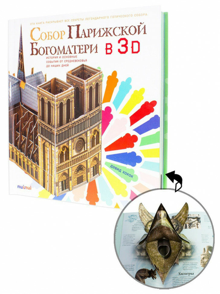 Это издание приобретено в другом магазине, но осмелюсь, будучи активным покупателем в Лабиринте, высказать свое мнение о книге, слегка понизив градус восторга от отзыва госпожи Зыряновой и указать на недостатки, которые не видны по фотографиям. Возможно это поможет сориентироваться потенциальным покупателям не слишком дешёвого издания. Итак, текст явно очень короткий и простенький, для тех, кто ну ничего не знает о Соборе: не читал, не бывал, не смотрел даже по ТВ, возможно, мечтает побывать в Париже или познакомить детей с шедевром готической архитектуры. Для таких читателей книга бесспорно будет информативна. Эстетически издание очень привлекательно. Но ведь главное и ценное в книге - это 3D-конструкции, их несколько, и самая главная - Собор Парижской Богоматери. Сама 3D-конструкция, не очень впечатляет из-за небольшого размера. Возможно точность деталей делает её очень ценной, но из-за скромных размеров по ней невозможно представить, на мой взгляд, масштаб и великолепие сооружения, единство внешнего облика и внутреннего интерьера.. Детали строения, интерьер собора в 3D представлены в отдельности, витражи нарисованы. Всё это любопытно, но как-то нет понимания общей концепции в выборе и исполнении деталей. Сразу вспоминается Собор, не Нотр Дам, но тоже готический, в книге "Город рыцарей", вот там полный восторг от 3D-конструкции, дающей представление о масштабе и деталях готических сооружений. Можно даже заглянуть вовнутрь здания и полюбоваться разноцветными витражами на просвет. Для детей просто необходимо тихонько открыть дверь и заглянуть: а что там внутри. С Нотр Дам этого не случится, т.к. всё что внутри как-то частями и в отдельности , но, правда, красиво. А в остальном книга очень не плоха, и со скидкой приобретена в домашнюю библиотеку.