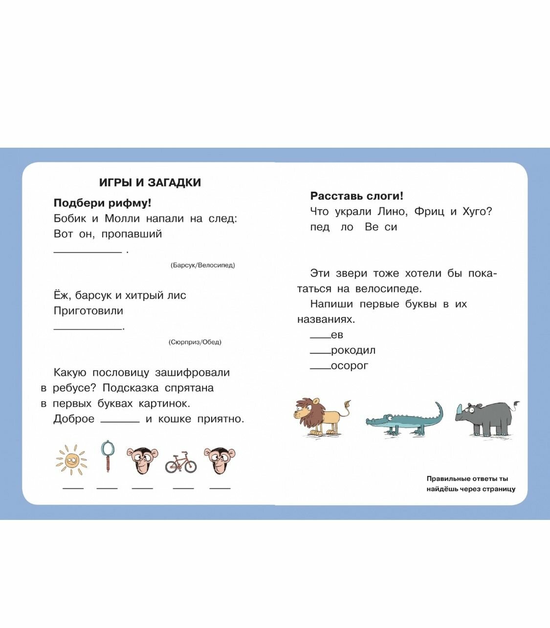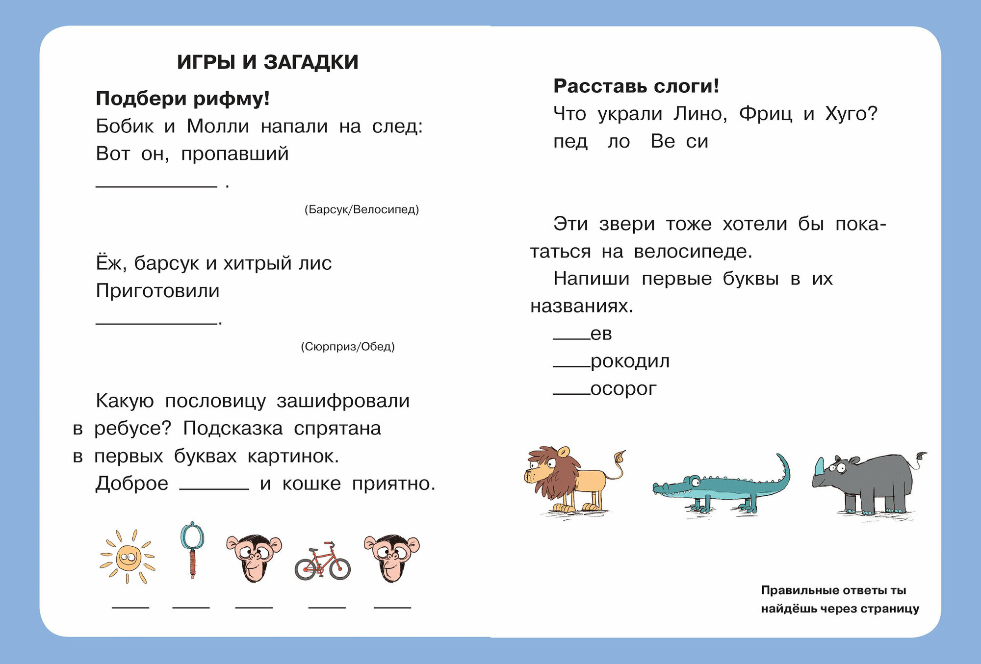 В конце книги есть задания (с ответами): подбери рифму, расшифруй пословицу, расставь в правильном порядке слоги!