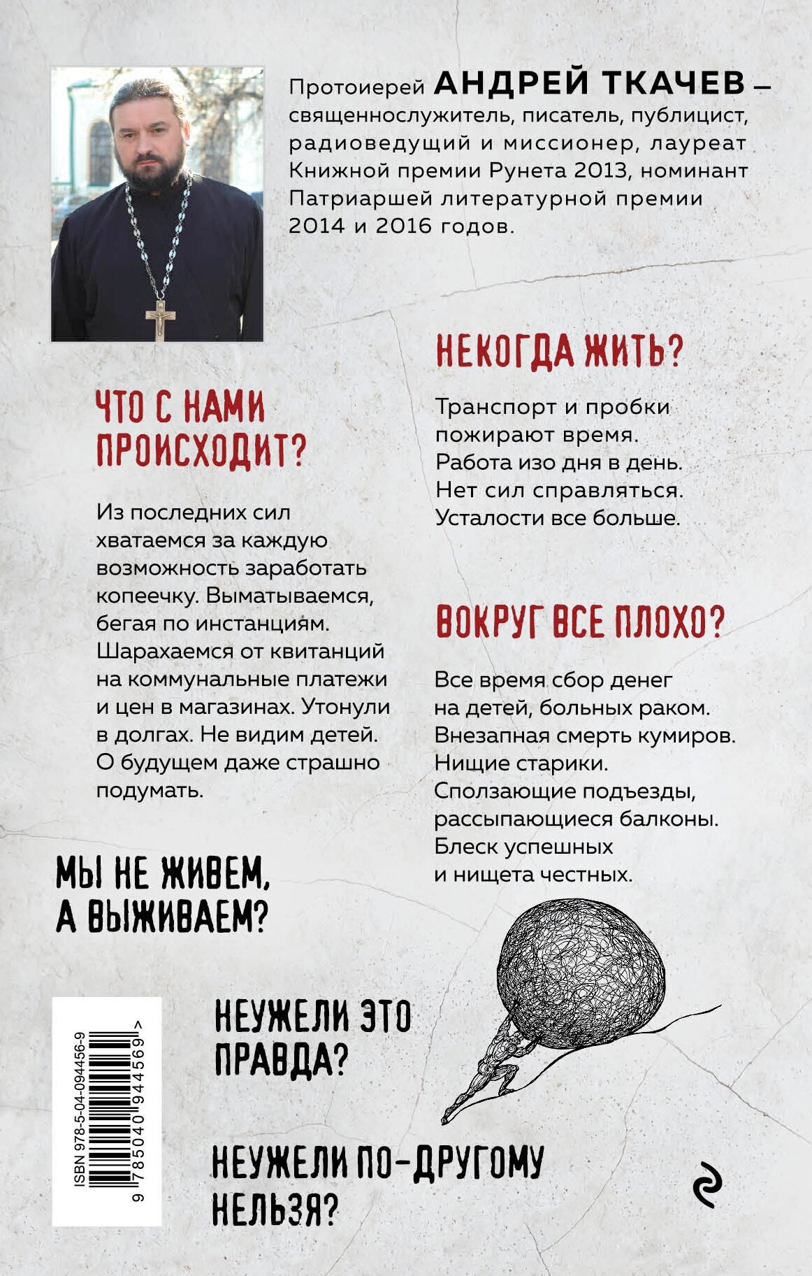 Мы не живем, а выживаем? Неужели это правда? Неужели по-другому нельзя? Из последних сил хватаемся за каждую возможность заработать копеечку. Выматываемся, бегая по инстанциям. Шарахаемся от квитанций на коммунальные платежи и цен в магазинах. Утонули в долгах. Не видим детей. О будущем даже страшно подумать. СМИ добивают ежедневными страшными известиями. Все время сбор денег на детей, больных раком. Внезапная смерть кумиров. Нищие старики. Сползающие подъезды, рассыпающиеся балконы. Блеск успешных и нищета честных. Работа изо дня в день. Транспорт и пробки, пожирающие время. Есть ли выход? Будет ли избавление? Новая книга протоиерея Андрея Ткачева посвящена суровым реалиям современной жизни россиян и выбору правильных ориентиров сегодня, здесь и сейчас.