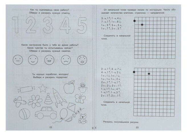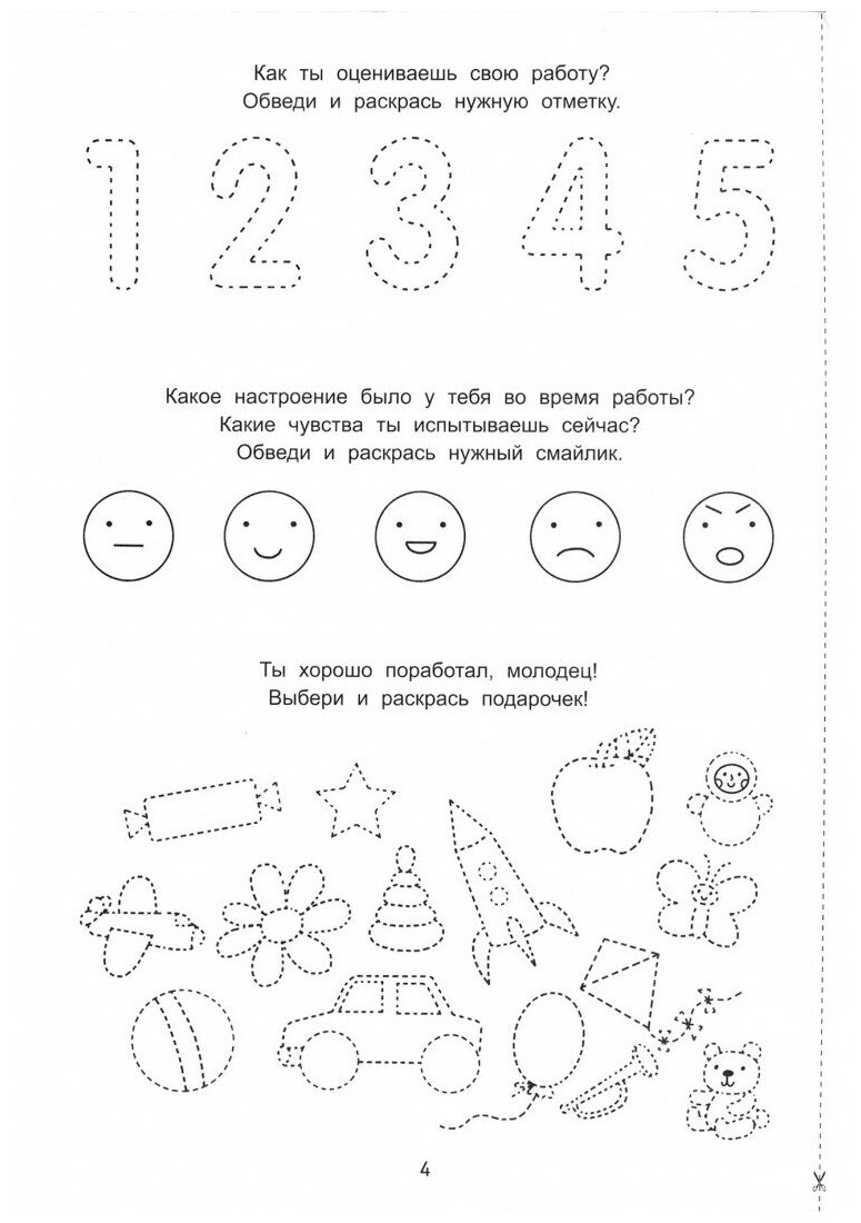 В конце занятия предлагайте ребёнку проанализировать и оценить свою работу. Для этого на каждом обороте страничек есть оценочно-эмоциональные рисунки, которые станут итогом выполненных заданий и дадут возможность ребёнку научиться оценивать собственный труд.