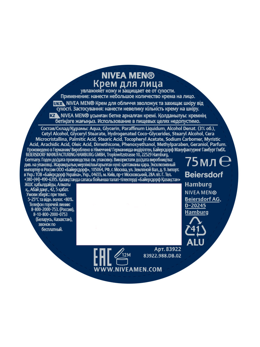 Описание товара:Крем NIVEA MEN разработан специально для мужской кожи с учетом ее особенностей. Его формула эффективно увлажняет кожу и защищает ее от сухости, а легкая текстура быстро впитывается без ощущения липкости. Крем обладает приятным мужским ароматом.Состав товара:Aqua, Glycerin, Alcohol Denat, Cetyl Alcohol, Glyceryl Stearate, Hydrogenated Coco-Glycerides, Stearyl Alcohol, Cera Microcristallina, Palmitic Acid, Stearic Acid, Tocopheryl Acetate, Sodium Carbomer, Myristic Acid, Arachidic Acid, Oleic Acid, Dimethicone, Phenoxyethanol, Methylparaben, Geraniol, Glycerin, Paraffinum Liquidum, Alcohol Denat. (0,03% об.), Cetyl Alcohol, Glyceryl Stearate, Hydrogenated Coco-Glycerides, Stearyl Alcohol, Cera Microcristallina, Palmitic Acid, Sodium Carbomer, Myristic Acid, Arachidic Acid, Oleic Acid, Dimethicone, Phenoxyethanol, Methylparaben, Geraniol, Parfum.Меры предосторожности:Индивидуальная непереносимость компонентов продукта. Избегать попадания в глаза. При попадании в глаза тщательно промойте их водой.Способ применения:Небольшое количество средства нанести на кожу лица тонким равномерным слоем мягкими массирующими движениями в течении 1-2 минут, дать впитаться.
