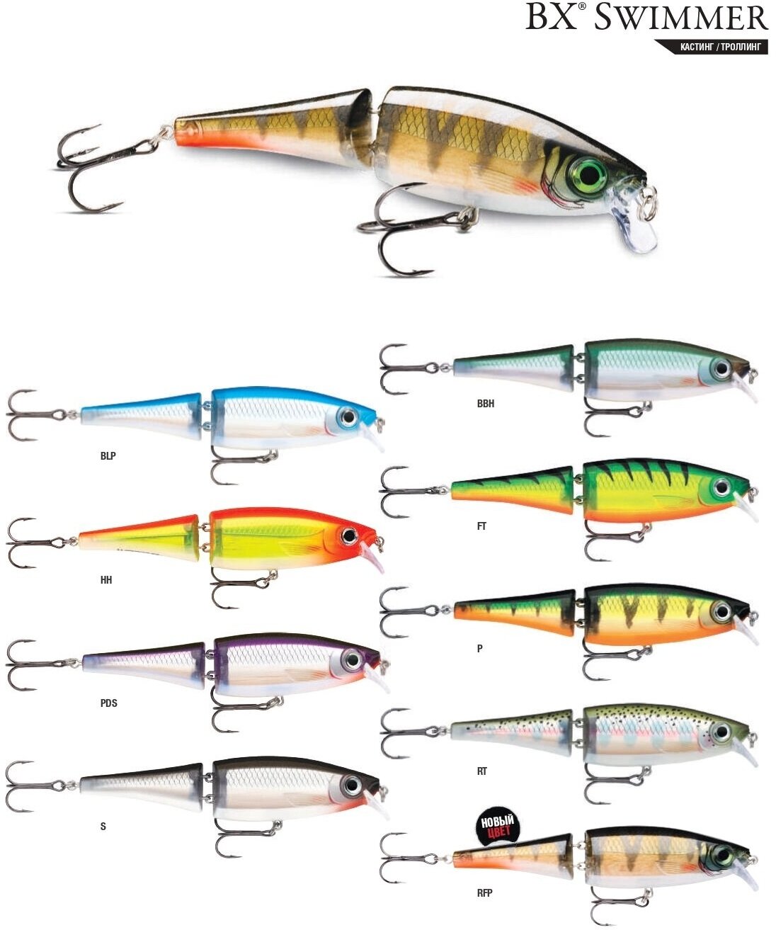 Воблер Rapala BX Swimmer имеет составное тело из бальсы в оболочке из полимера. Конструкция из двух шарнирных креплений позволяет приманке двигаться натурально, совершая движения с большой амплитутой даже при самой медленной проводке. Высокая детализация при нанесении рисунка. Балансировка воблера позволяет совершать дальние забросы.