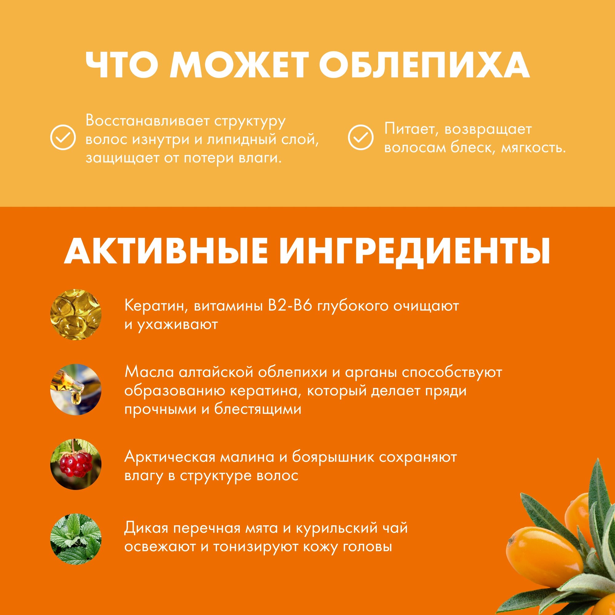 Глубоко очищает и освежает волосы и кожу головы, питает и укрепляет волосяные луковицы, стимулируя рост волос. Оказывает обновляющее и противовоспалительное действие, устраняет перхоть, улучшает кровообращение. Эффективен в борьбе с выпадением волос. Входящие в состав шампуня витамины и аминокислоты питают и восстанавливают волосы, масло алтайской облепихи и марокканское масло арганы способствуют образованию кератина, обеспечивающего волосам блеск и прочность. Арктическая малина и боярышник сохраняют влагу глубоко в структуре волос. Дикая перечная мята и курильский чай очищают, освежают и тонизируют кожу головы, стимулируют кровообращение. Шампунь придает волосам жизненную силу и необыкновенное ощущение свежести.