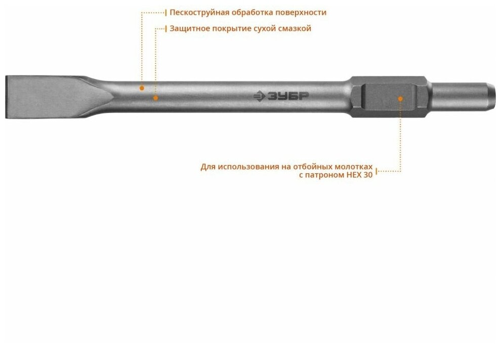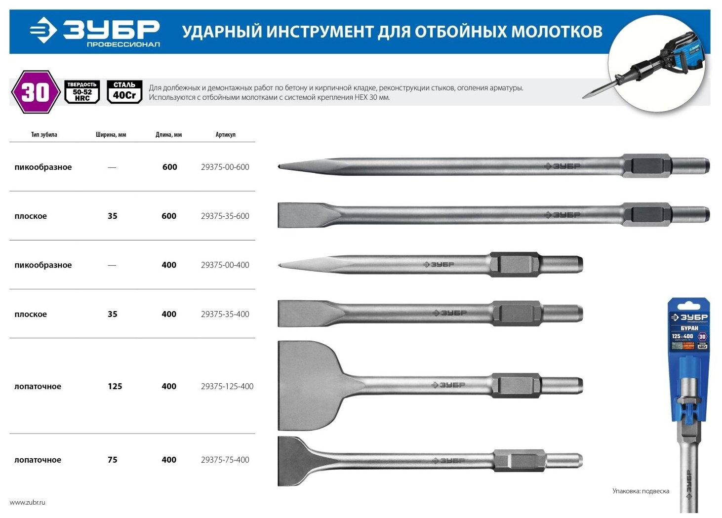 Для долбежных и демонтажных работ по бетону и кирпичной кладке, реконструкции стыков, оголения арматуры. Используется с ударными перфораторами с системой крепления НЕХ 30 мм. Индукционная трехступенчатая закалка со строгим соблюдением температур в каждой зоне при термообработке для повышения стойкости и увеличения рабочего ресурса инструмента. Высокопрочная легированная сталь гарантирует продолжительный срок службы инструмента. Высокая устойчивость зубил по отношению к ударам и динамическим нагрузкам. Шлифованная круглая форма зубил. Износостойкое покрытие защищает от коррозии. Зубила ЗУБР - ударный инструмент высокого качества и надежности обладающий высокой стойкостью к любым нагрузкам!