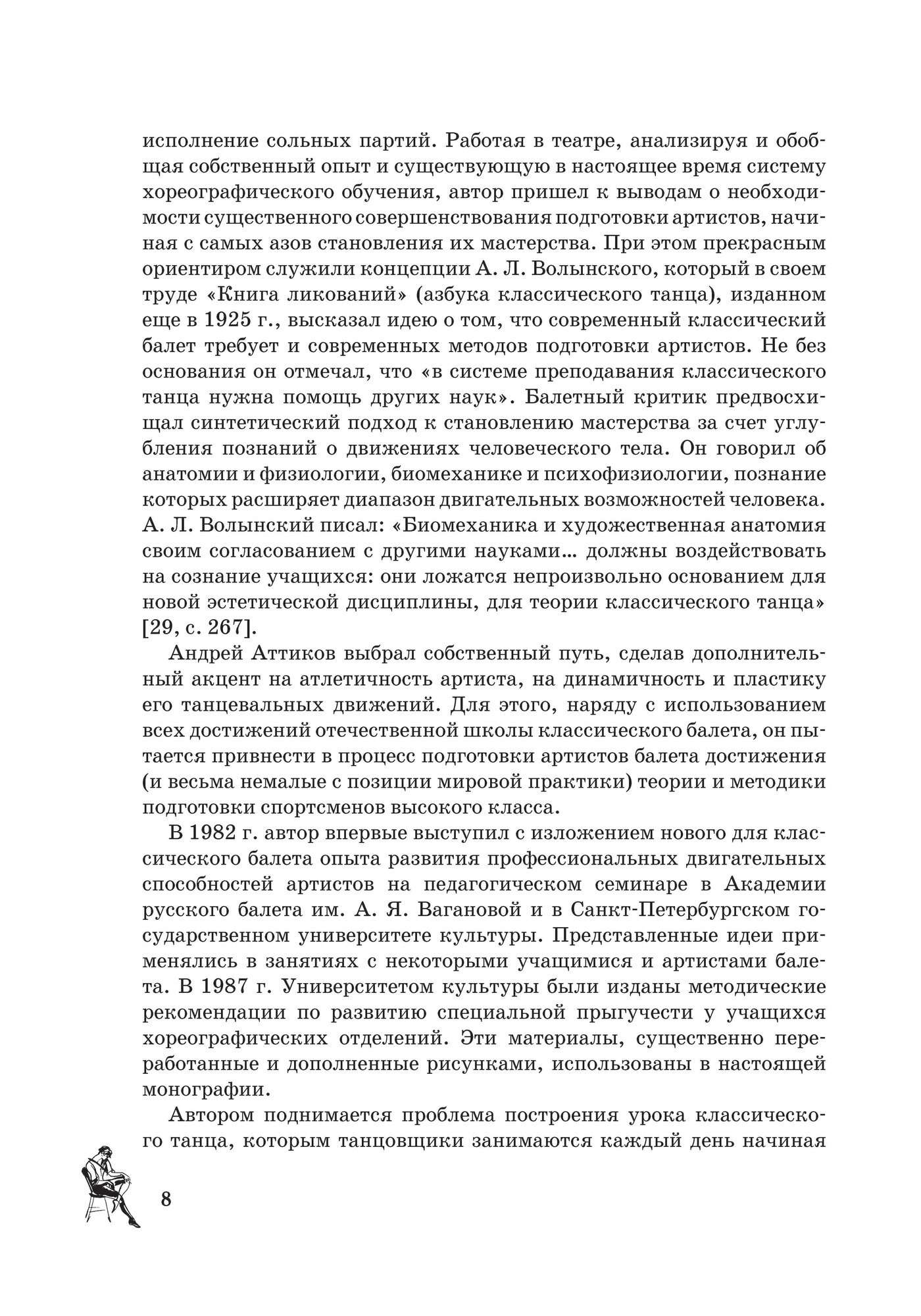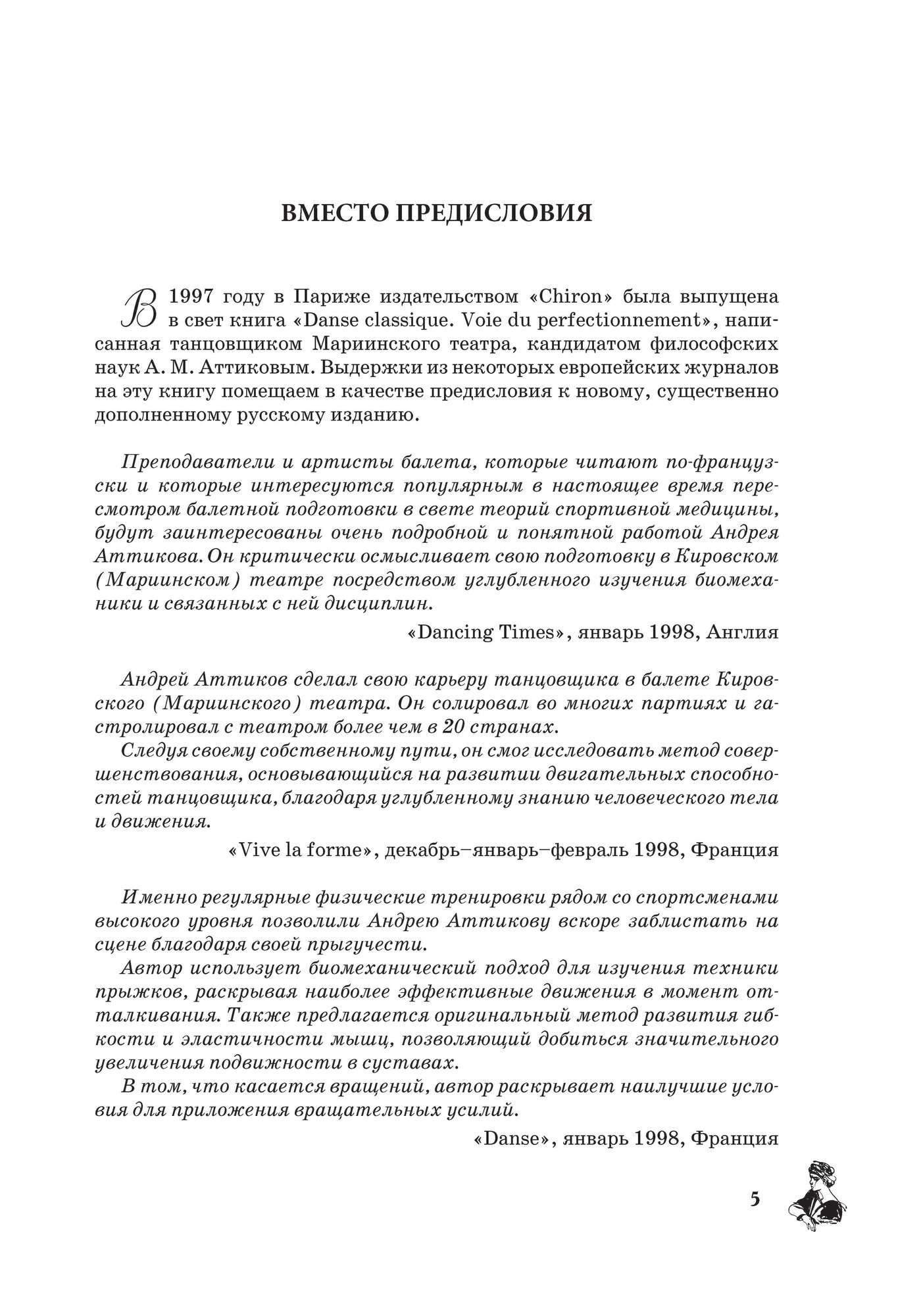 Опыт сольных выступлений на сцене Мариинского театра, а также научные знания, полученные на философском факультете СПбГУ, позволили автору книги проникнуть в глубину проблем, существующих в подготовке артистов балета, и предложить свои научно обоснованные и проверенные на практике решения. Это касается и основ правильного построения уроков классического танца, и развития природных данных занимающихся хореографией, и техники исполнения сложных танцевальных движений, и регулирования нагрузок.
