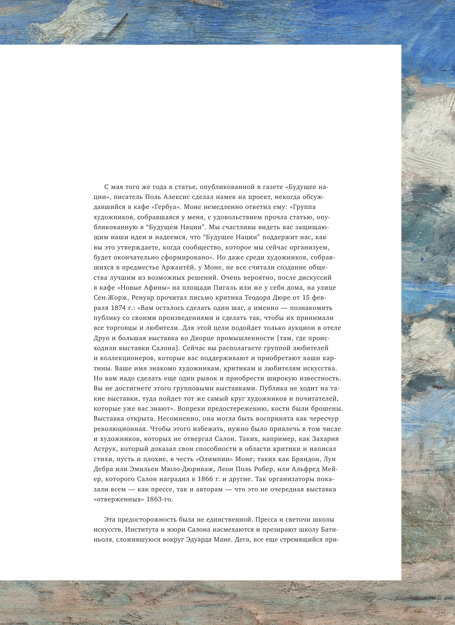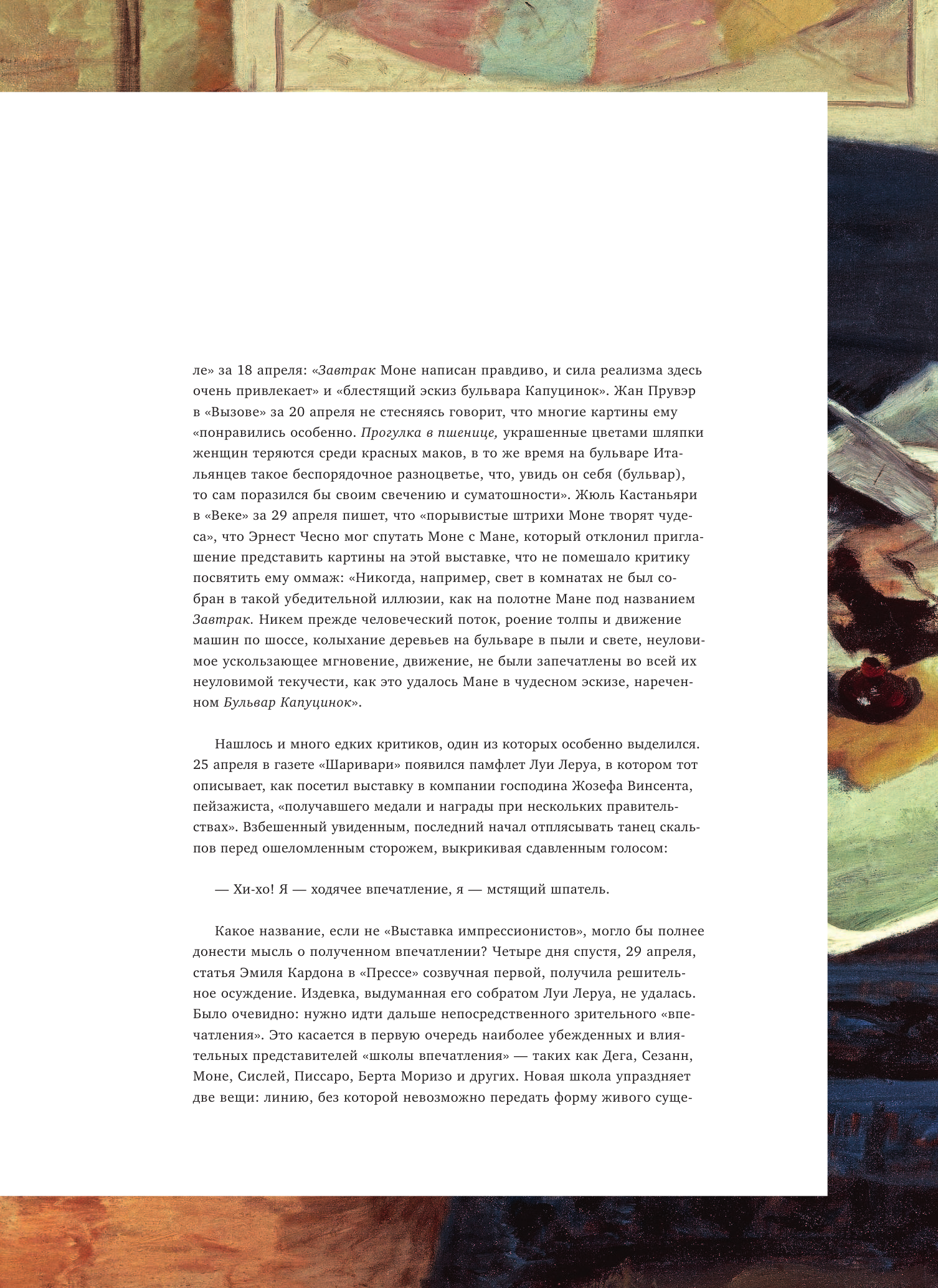 Автор приводит заметки прессы того времени (как хулителей, так и защитников), мнения таких легендарных людей, как Золя, Гюисманс и Готье, представляет на суд читателя взгляд импрессионистов на свои работы. В книге есть все - чудо, сомнения, бунт и очарование, которые неразрывно следовали за направлением в искусстве, завоевавшим миллионы сердец. Большой формат книги позволит вам разглядеть каждую из деталей заглавных произведений импрессионизма, а качество печати не оставит равнодушным ни одного эстета. Отличный подарок для ценителя живописи!
