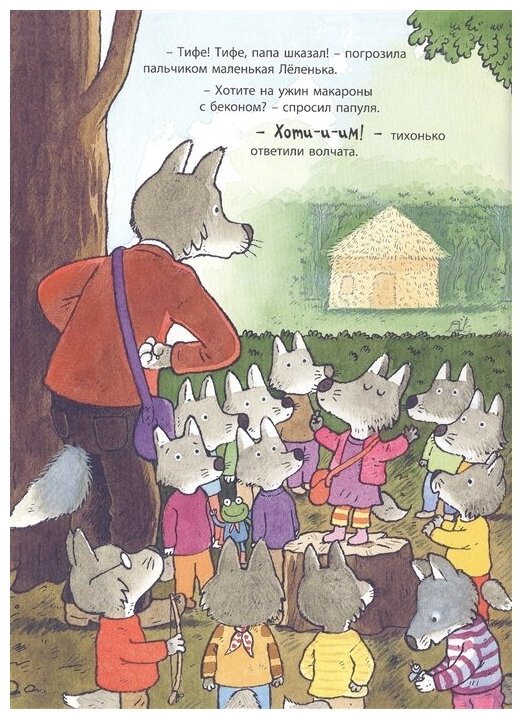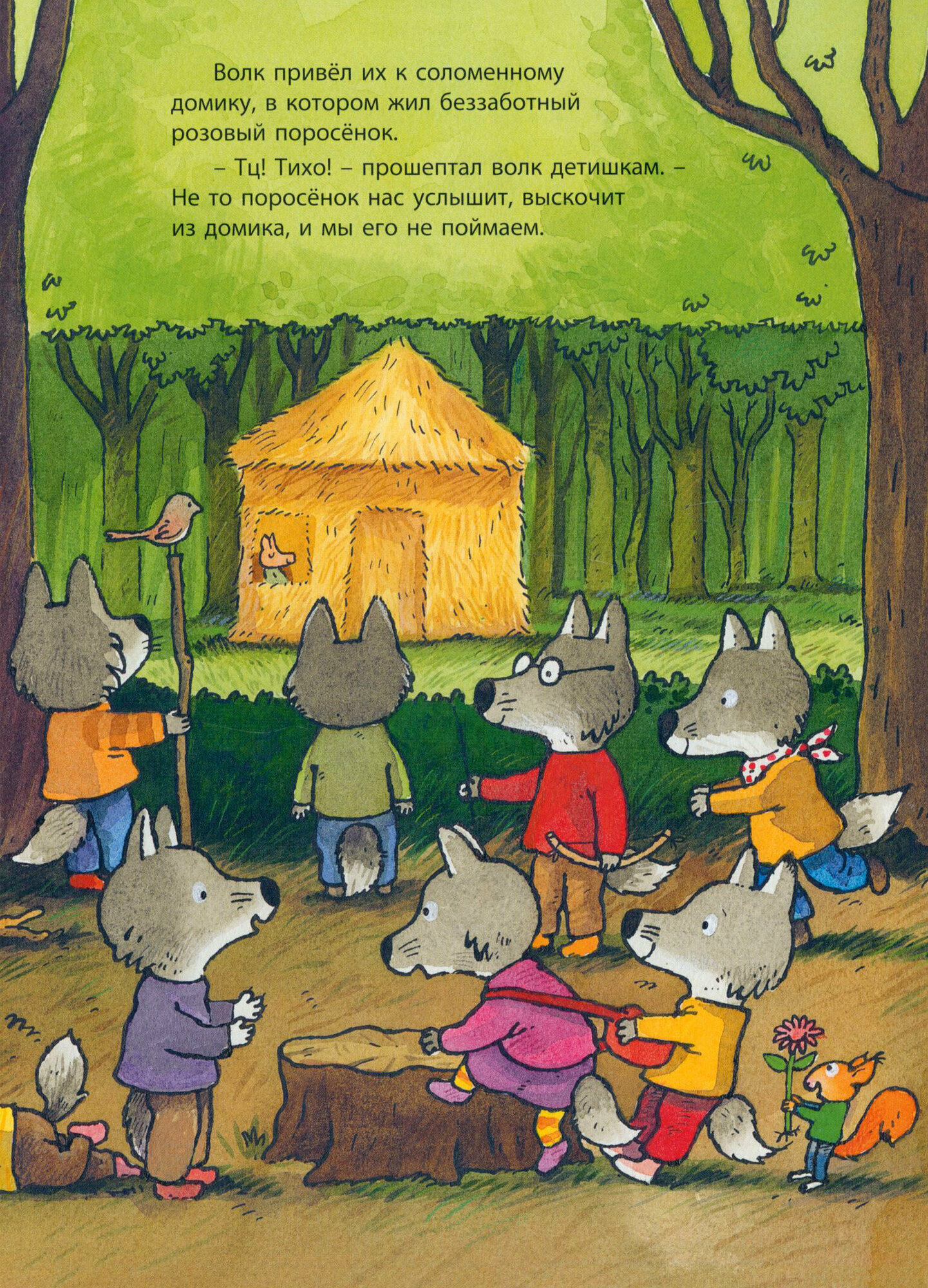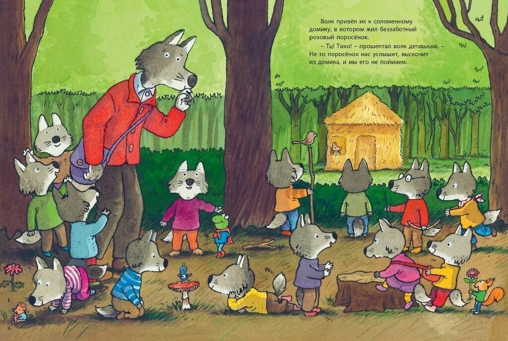Весёлая и правдивая история о том, как однажды страшному серому волку пришлось взять с собой на «работу» всех своих волчат. Волки всей семьёй отправились к домикам знаменитых трёх поросят. Это был самый трудный день в жизни папы-волка. Но зато ни один поросёнок в лесу не пострадал!
