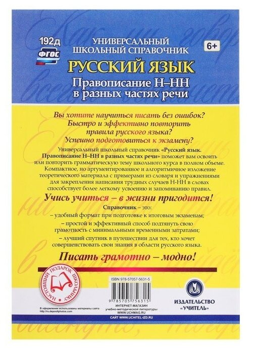 Сервис сравнения цен СкидкаГИД предлагает сравнить цены на товар «Книга: ФГОС Универсальный школьный справочник. Русский язык. 5-11 класс. Правописание Н-НН в разных частях речи. Алгоритмы. Упражнения. Проверочные тесты. Сл (Пряникова Ольга Витальевна); Учитель, 2020»