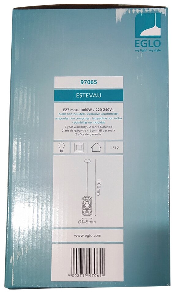 Подвесной светильник Estevau 97065 - продукт известной компании Eglo (Австрия). Имеет максимальную мощность 60 Вт, освещает площадь до 4 кв. м. Отлично подойдет для таких мест, как гостиная, прихожая и коридор, кафе, кухня, над обеденным столом, магазин, над кухонным островом. Впишется в интерьеры следующих стилей: винтаж.