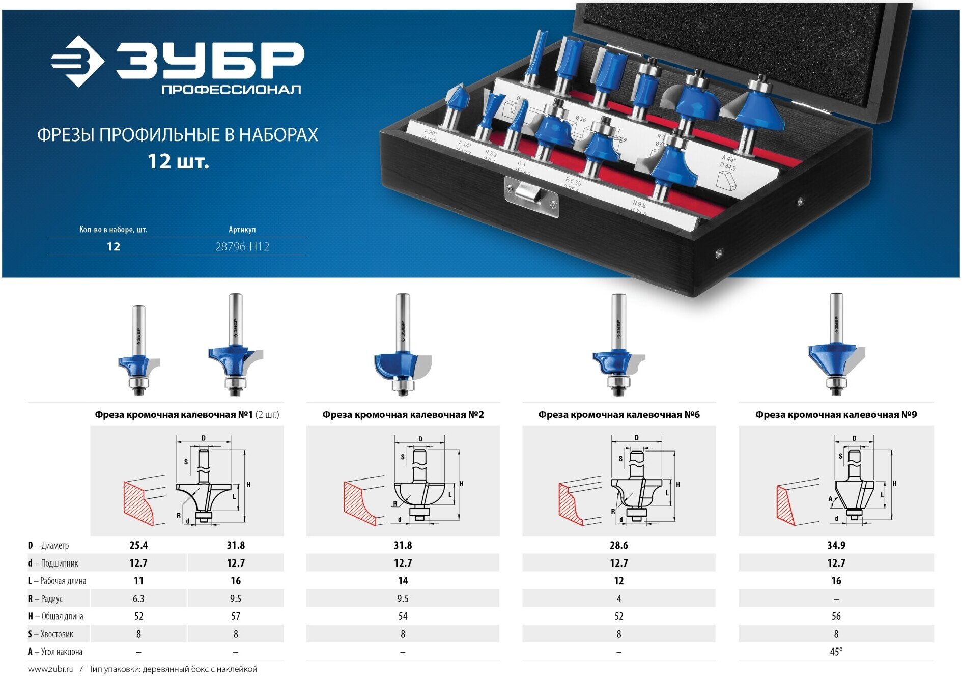 Набор фрез ЗУБР ''ПРОФЕССИОНАЛ'' 12 шт профильных по дереву-Подходит для обработки кромок филенок при работе с различными видами древесины-Используется на фрезерных станках и ручных фрезерах при обработке мебели, столярных изделий, предметов интерьера, а также реставрационных работах и внутренней отделке-Высококачественный мелкозернистый твердый сплав для высокого ресурса-Самая точная заточка режущих кромок на современных 5-ти координатных станках с ЧПУ-Кол-во в наборе: 12 шт.-Марка твердого сплава: ВК 6-Максимальные обороты , мин-1: 24000-Хвостовик: 8 ммКомплектацияКромочные фрезы:Калевочные №1Калевочная №2Калевочная №6Калевочная №9Прямая с нижним подшипникомПазовые фрезы:ПрямыеЛасточкин хвостГалтельнаяГалтельная V-образнаяДанный материал взят со страницы: