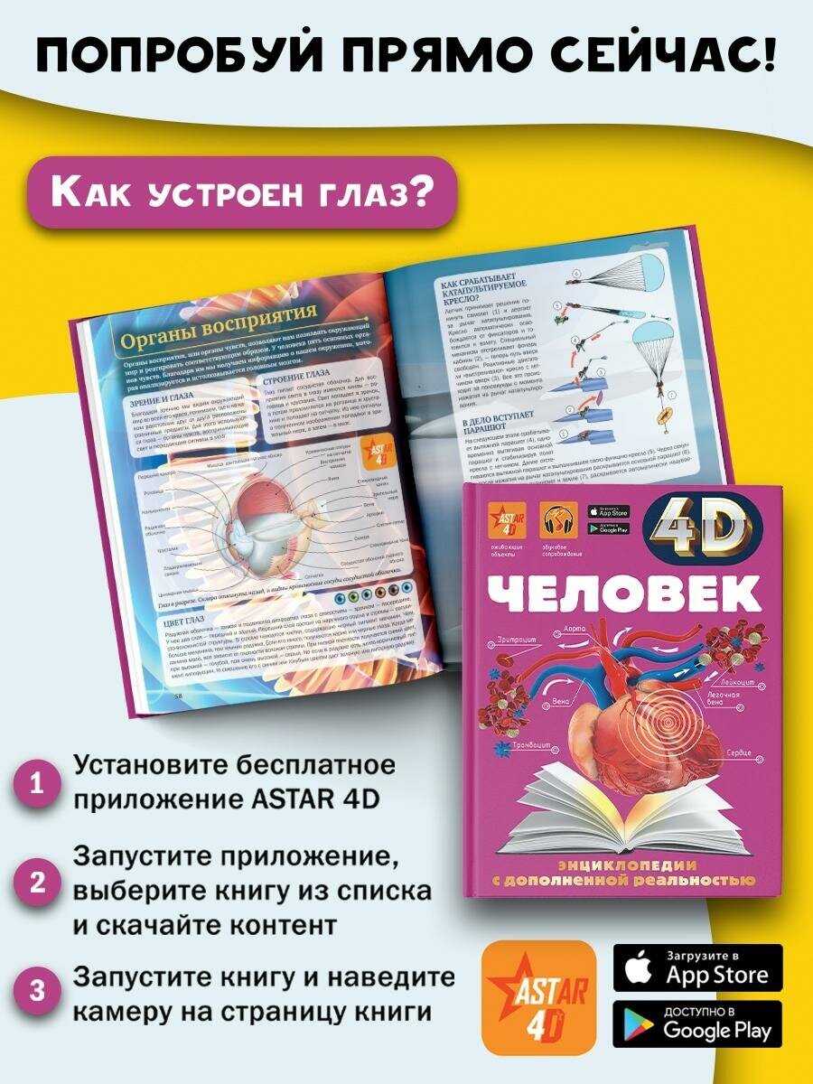Эта 4D-энциклопедия с дополненной реальностью расскажет обо всех этапах становления человека - начиная с возникновения Вселенной и заканчивая той самой минутой, когда вы читаете эту книгу. Зарождение живых организмов и их эволюция, развитие первобытного человека и анатомия современного, механизмы наследственности и сила иммунитета, эмоции и чувства людей и бесстрастность роботов - все это вы найдете на страницах данного издания. А "живые" иллюстрации покажут, как функционирует сердце и где находится печень, заставят австралопитека помахать вам рукой из прошлого, а робота - исследовать космос, познакомят с самыми маленькими нашими "врагами" - вирусами и бактериями. Каждую анимацию дополняет познавательная звукозапись. Откройте эту необычную энциклопедию и узнайте больше о себе и мире, частью которого является каждый из нас.